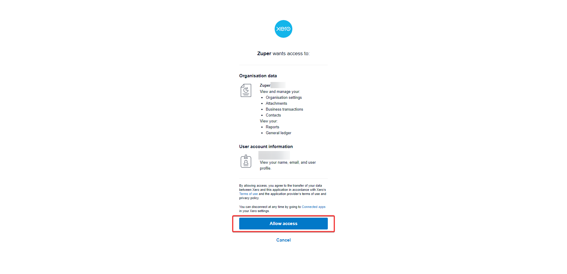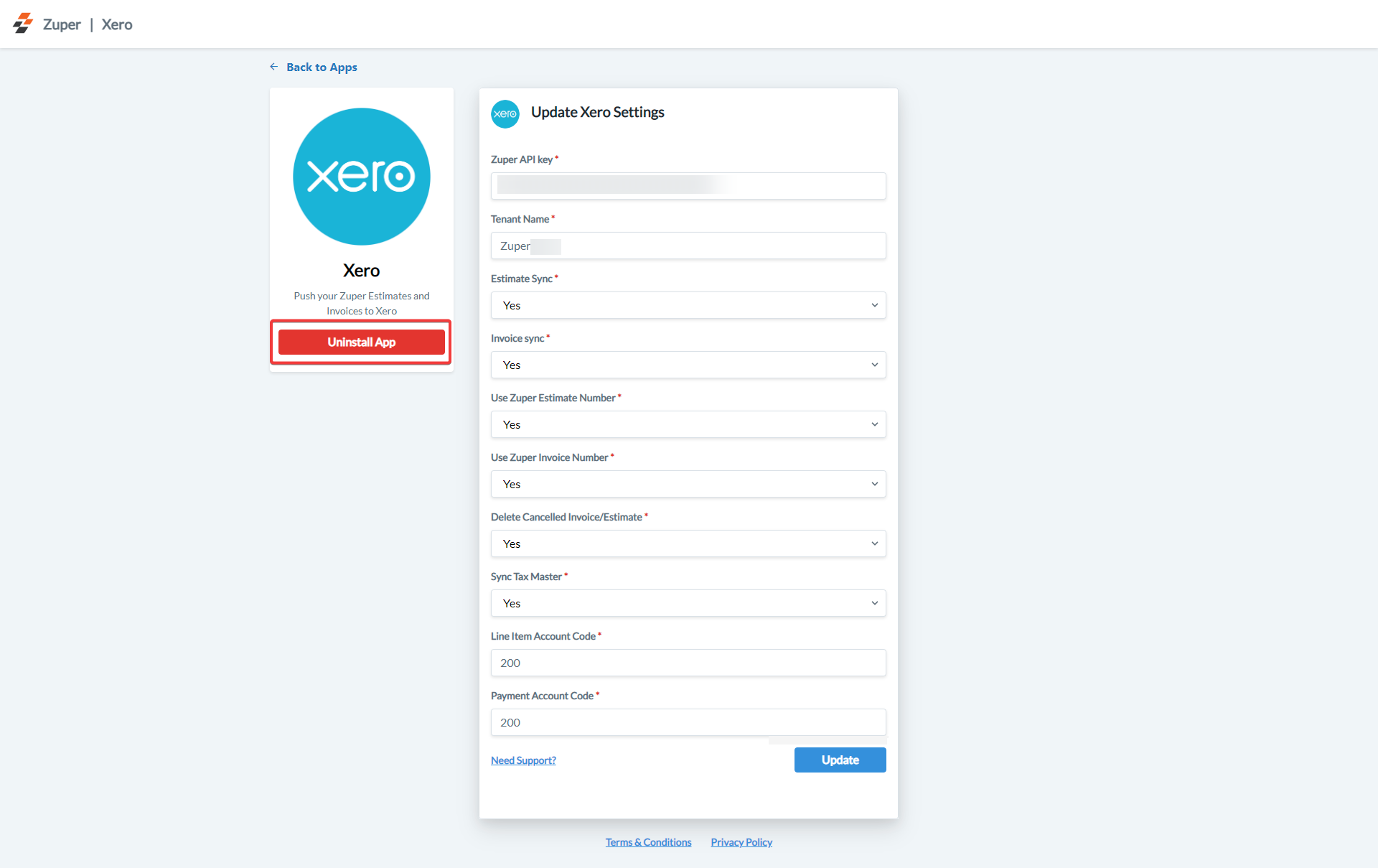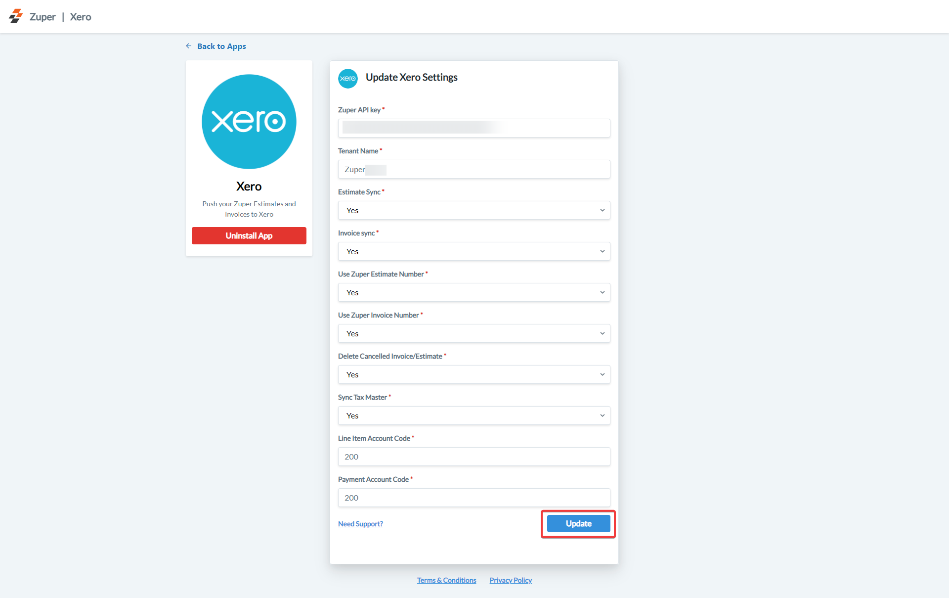 if you use the same account code for the product and payments. Select the “Update” button to connect Xero app with Zuper.