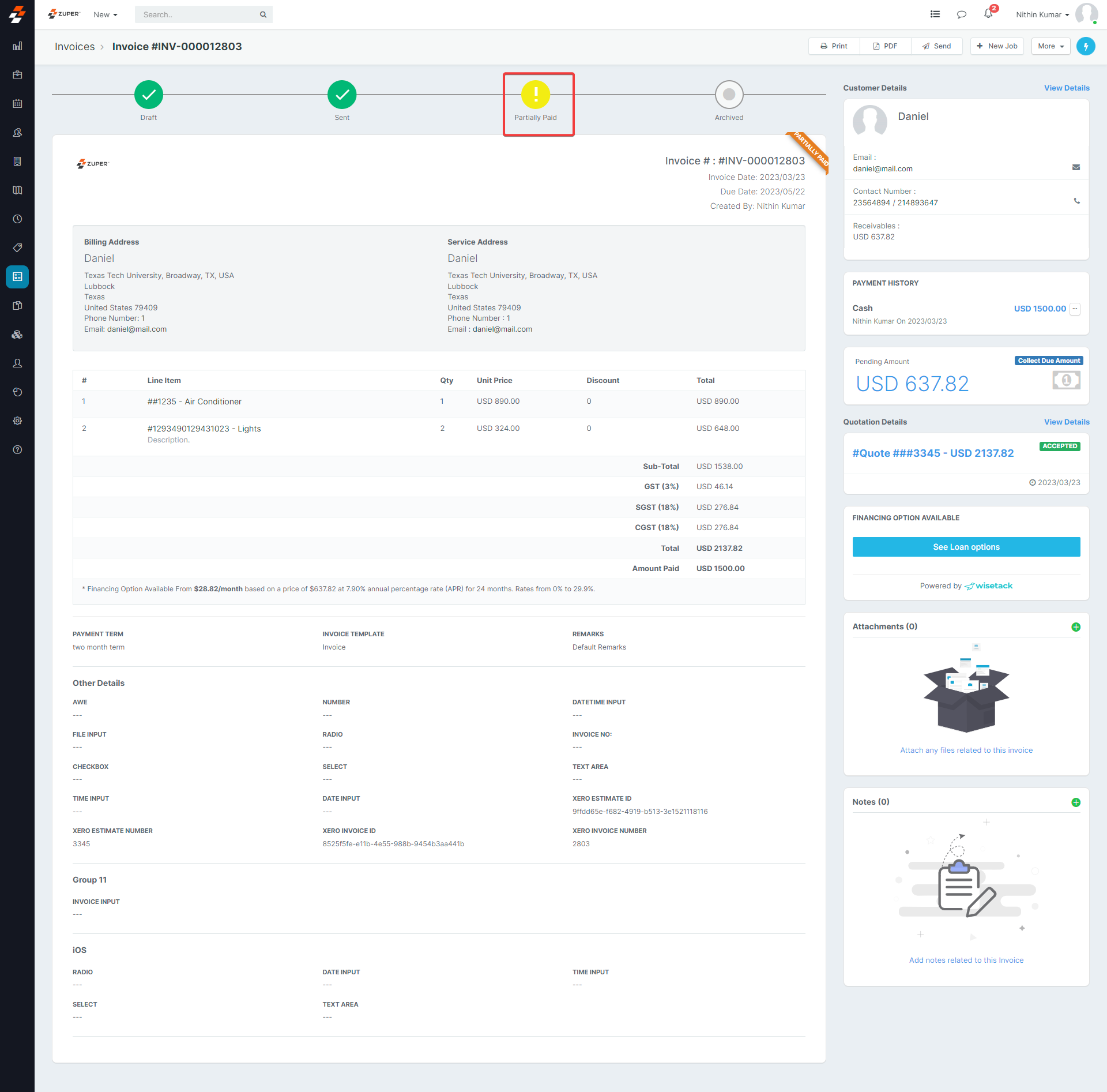 2. The invoice created in Zuper will be reflected in Xero based on earlier installation steps.