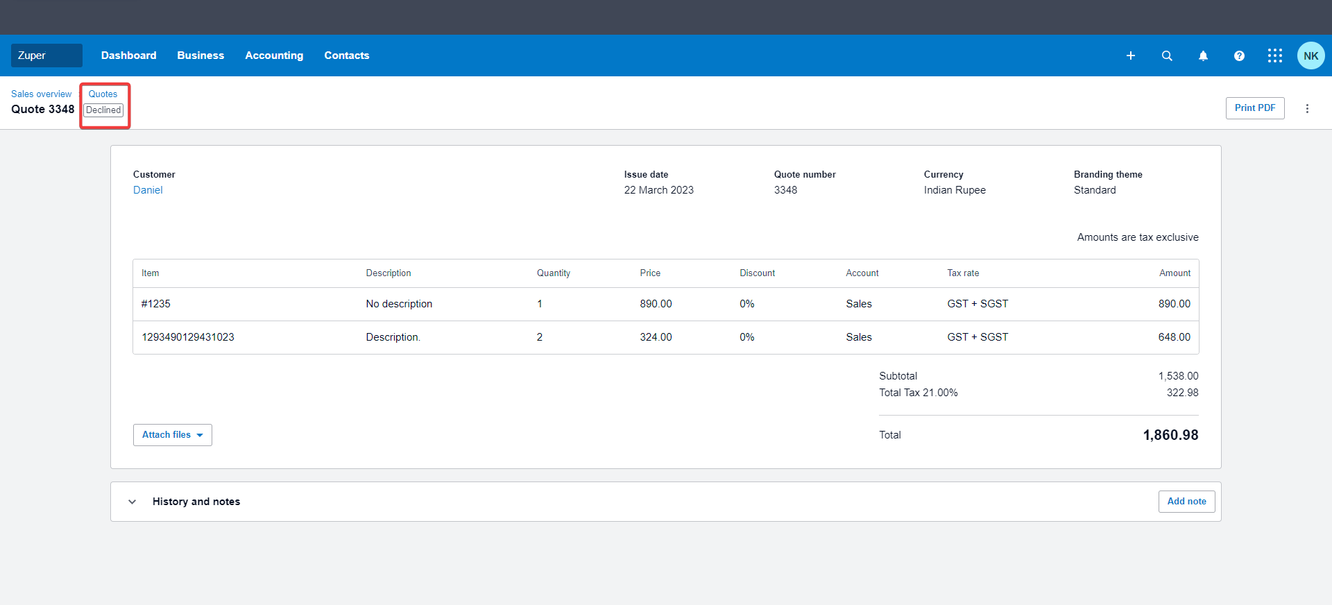 The quotation created in Zuper will be reflected in Xero based on earlier installation steps.