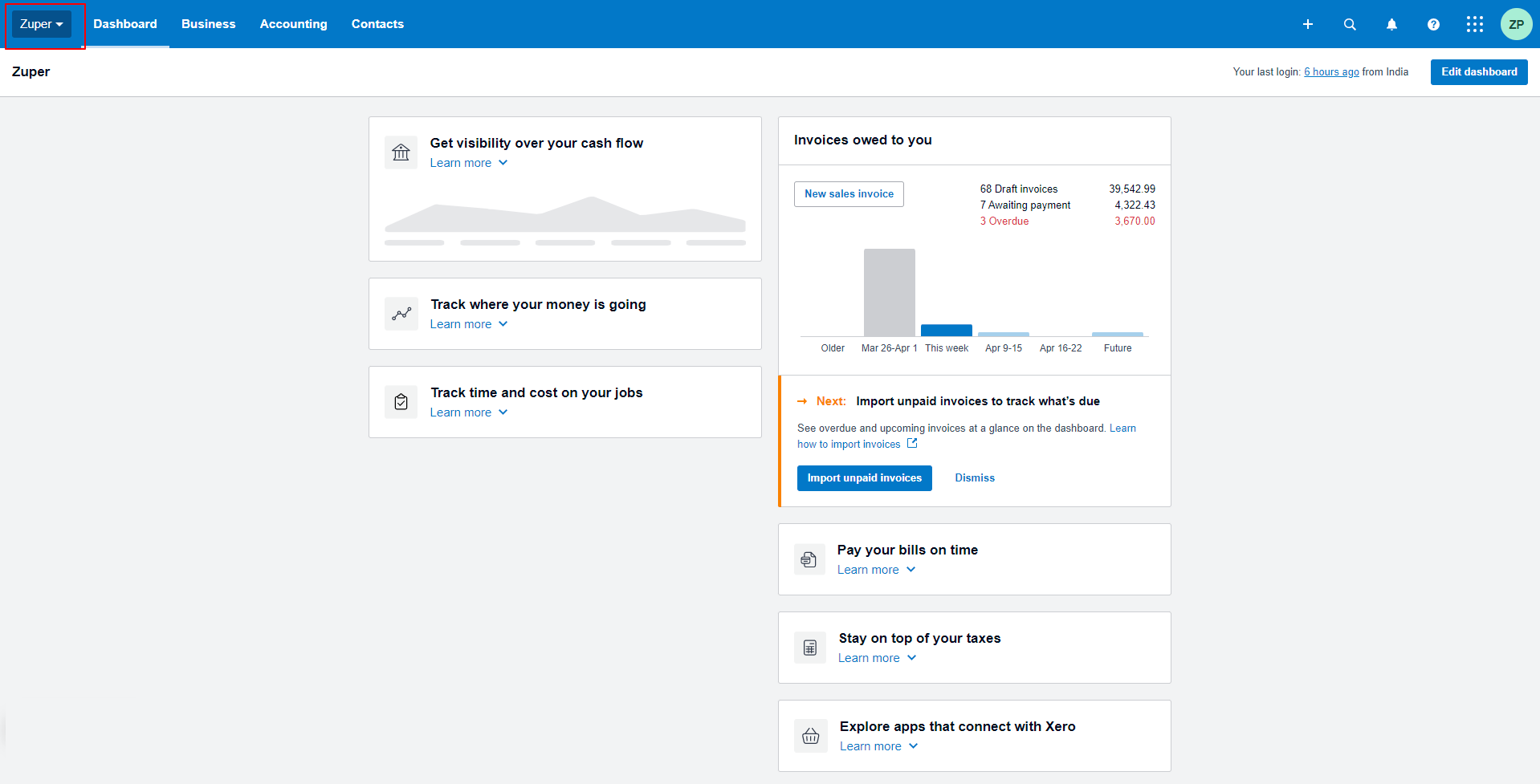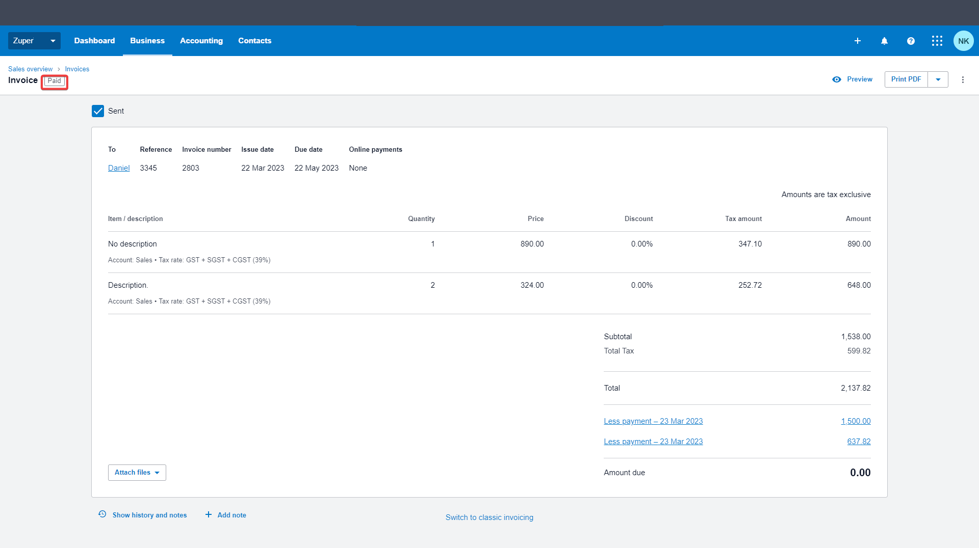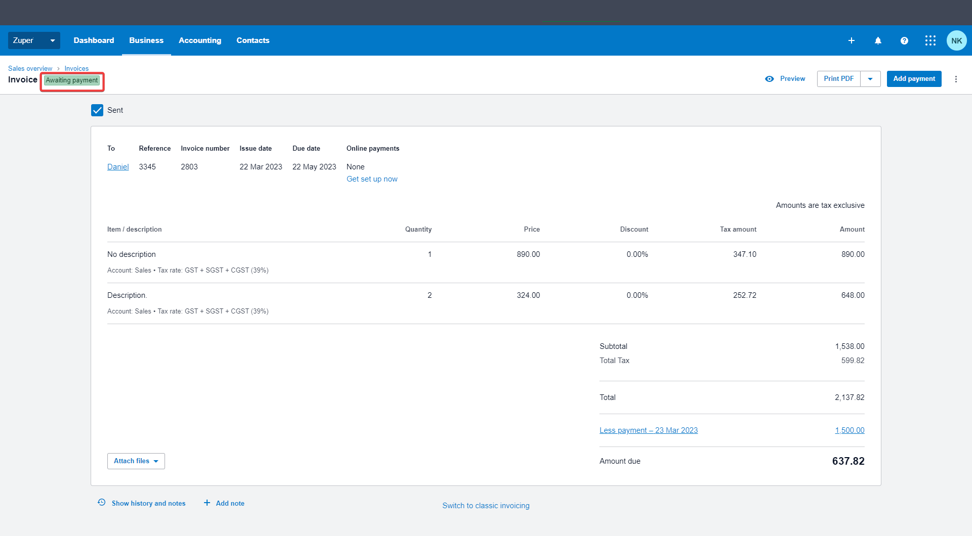 In this case, the partially paid invoice of Zuper will be reflected in Xero.