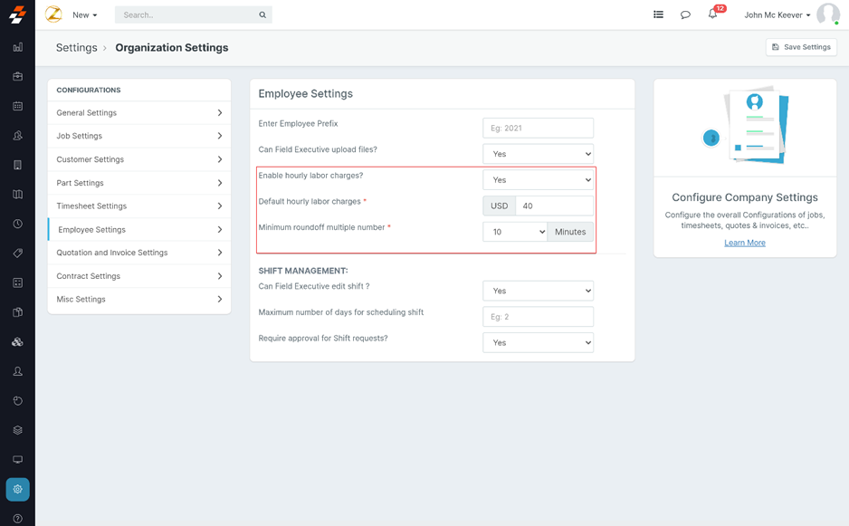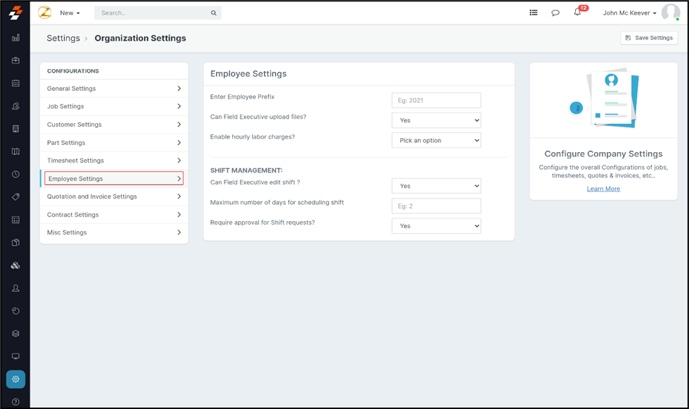 Navigation: Settings --> Organization Settings -->Employee Settings - Set