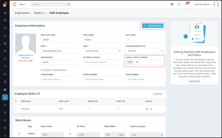 month’s “Hourly Labor Charge” feature, and click the “Save Employee”