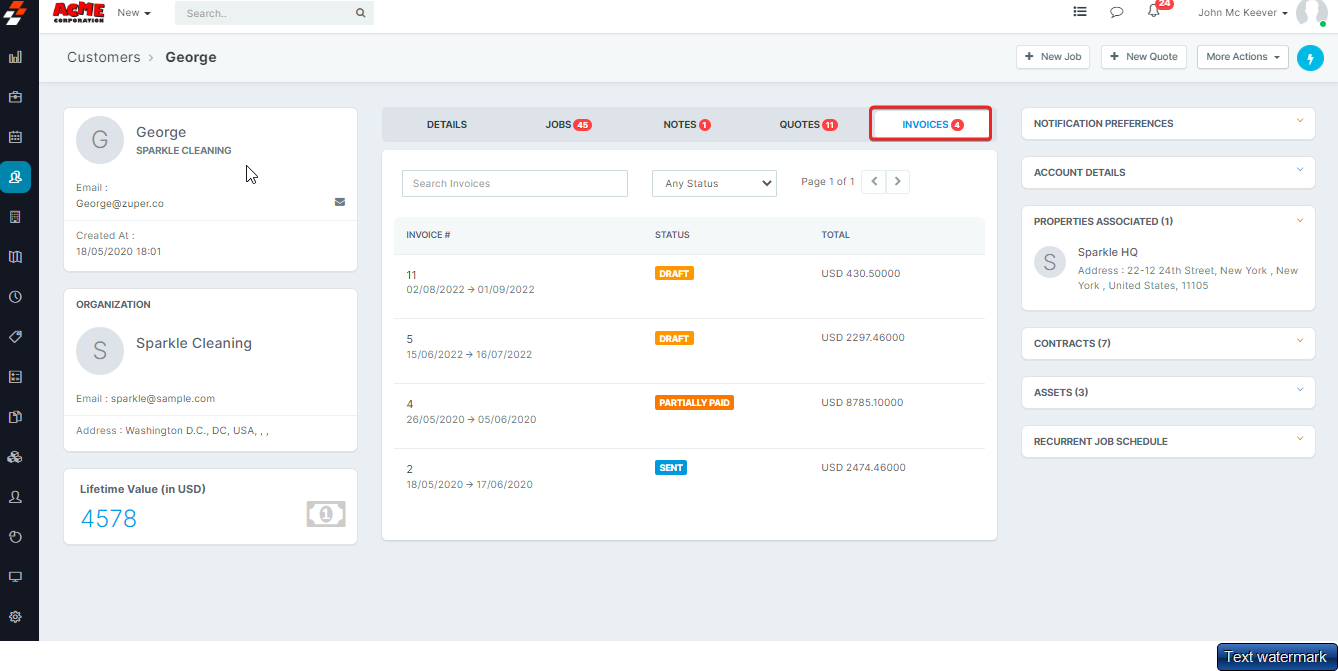 - The middle pane consists of important sections like Details, Jobs, Notes, Quotes, and Invoices. - The right pane shows service contracts and assets associated with the customer.