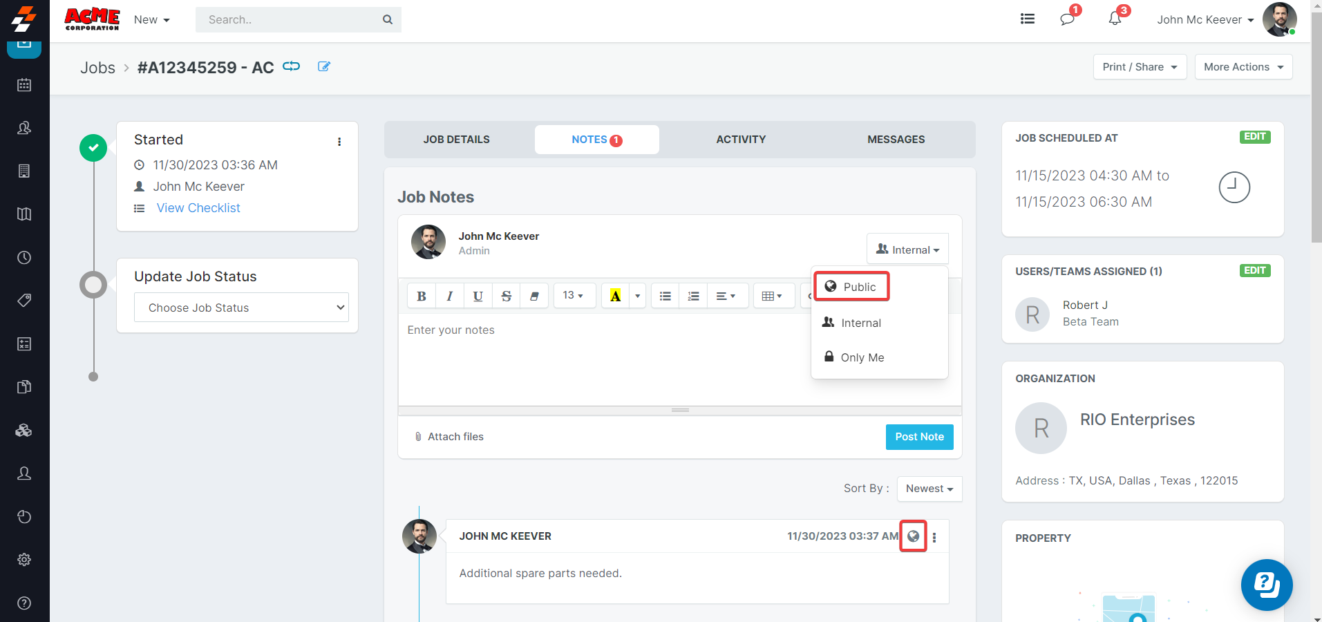 Job Notes are comments or information that are added to a job over its course. These job notes add more context to the job.