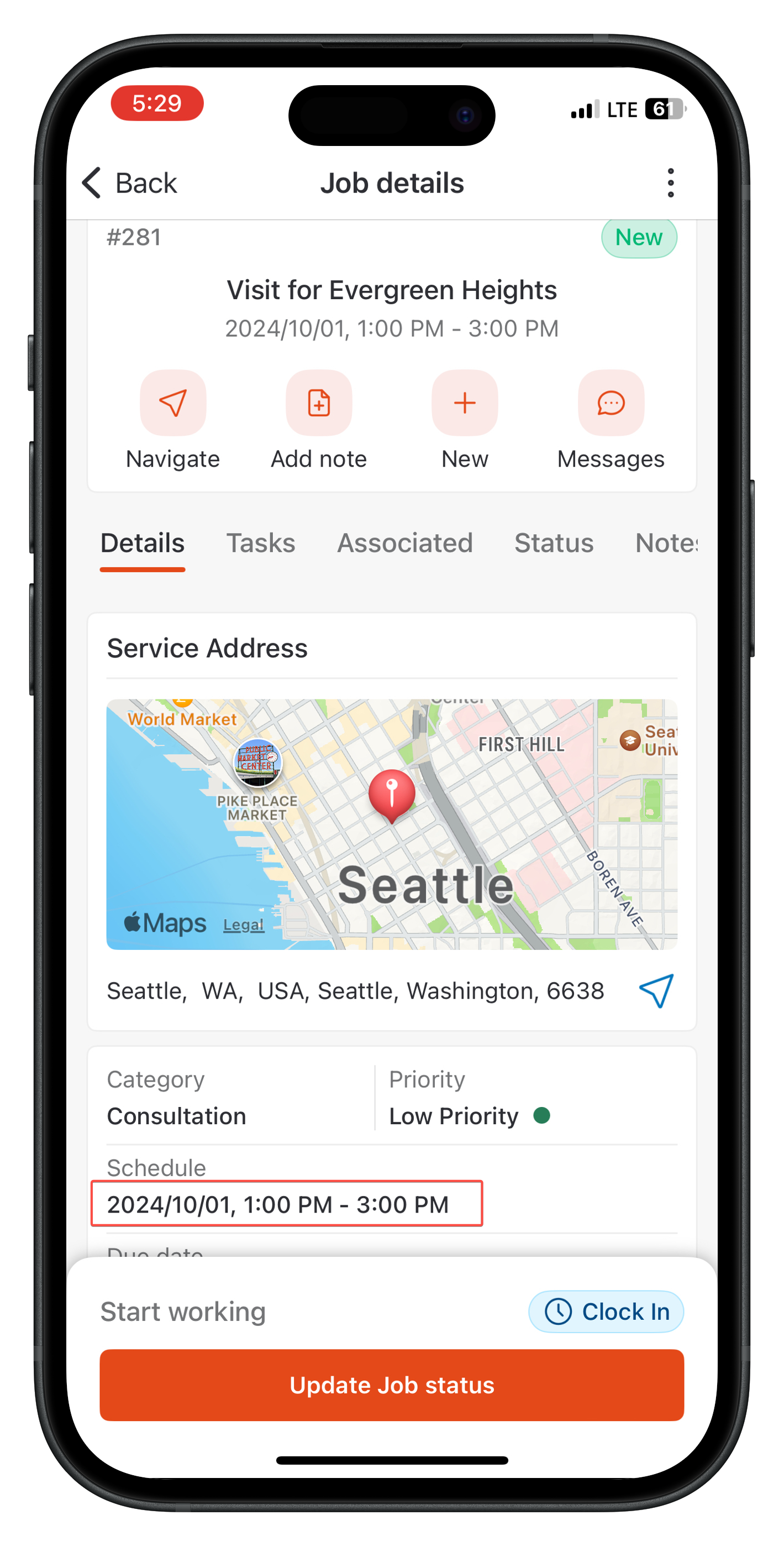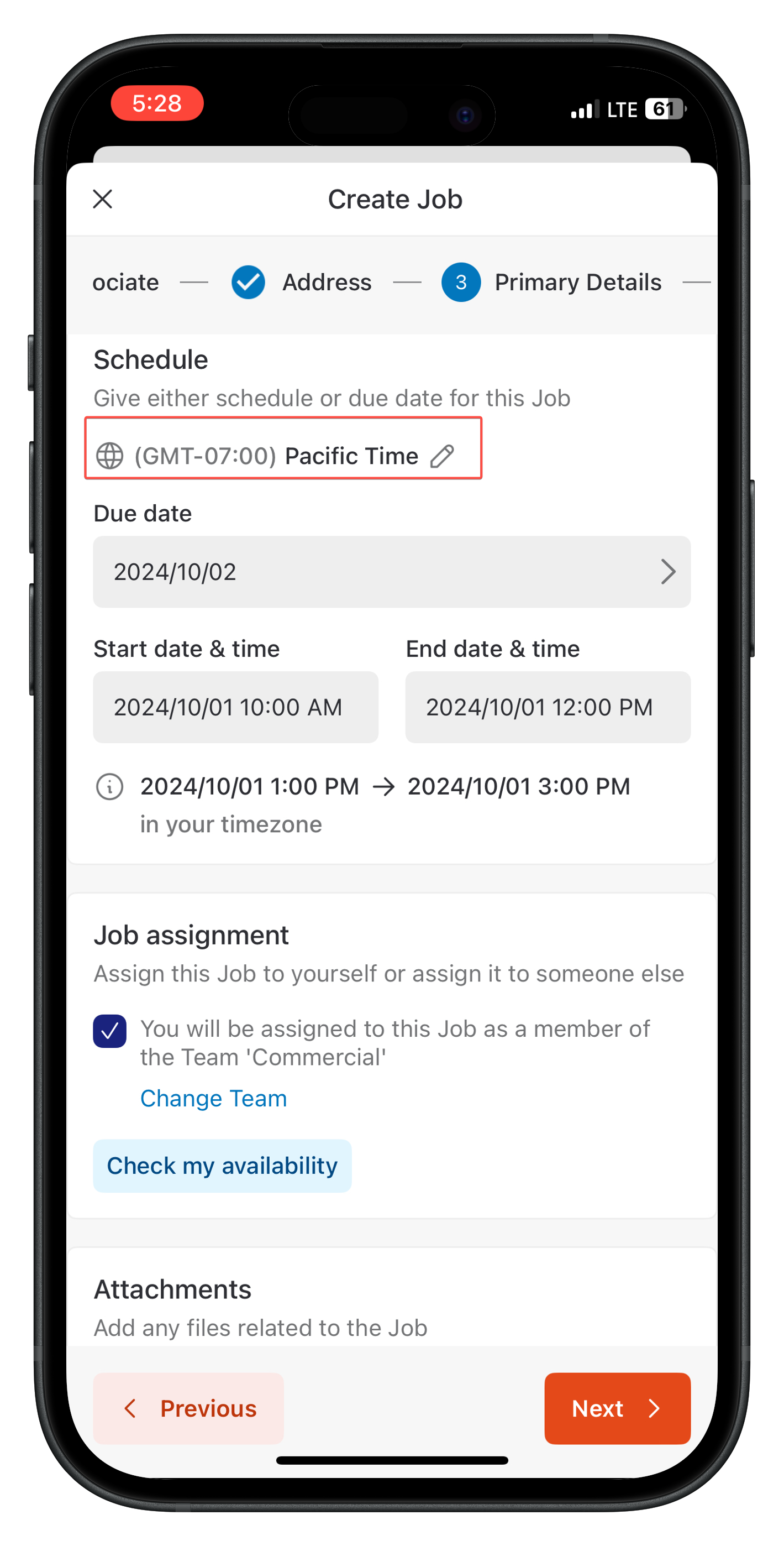In the mobile app, field technicians can view assigned job details, including the scheduled date and time, by default in their device's time zone. However, jobs can also be created and rescheduled in a preferred time zone. Follow these steps to set a time zone when creating a job: