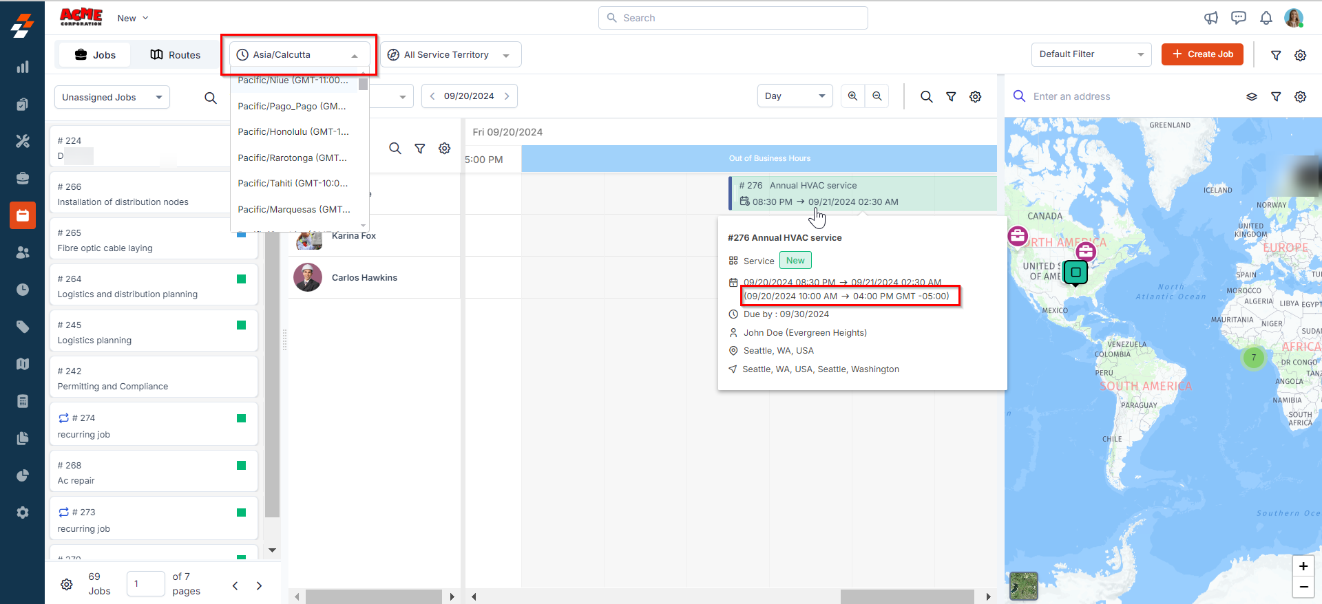All the jobs in the Dispatch Board will be displayed in the time zone selected in the picker at the top. Upon hovering over a job, you can view the schedule in the selected time zone as well as the time zone the job was scheduled in. When creating a job from the Dispatch Board, the selected time zone would be pre-filled.