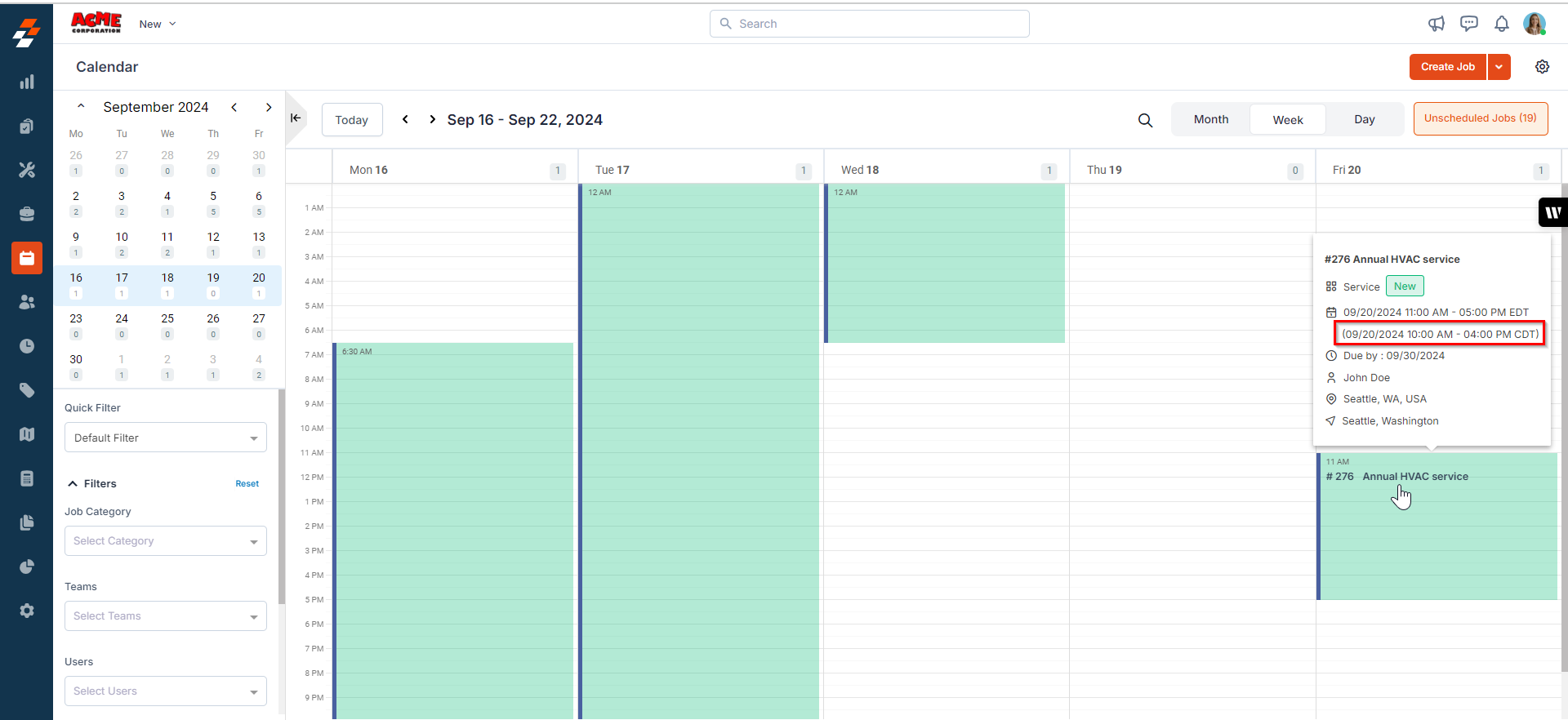 The Calendar always displays jobs in the account's time zone. Upon hovering over a job, you can view the schedule in the selected time zone as well as the time zone the job was scheduled in.