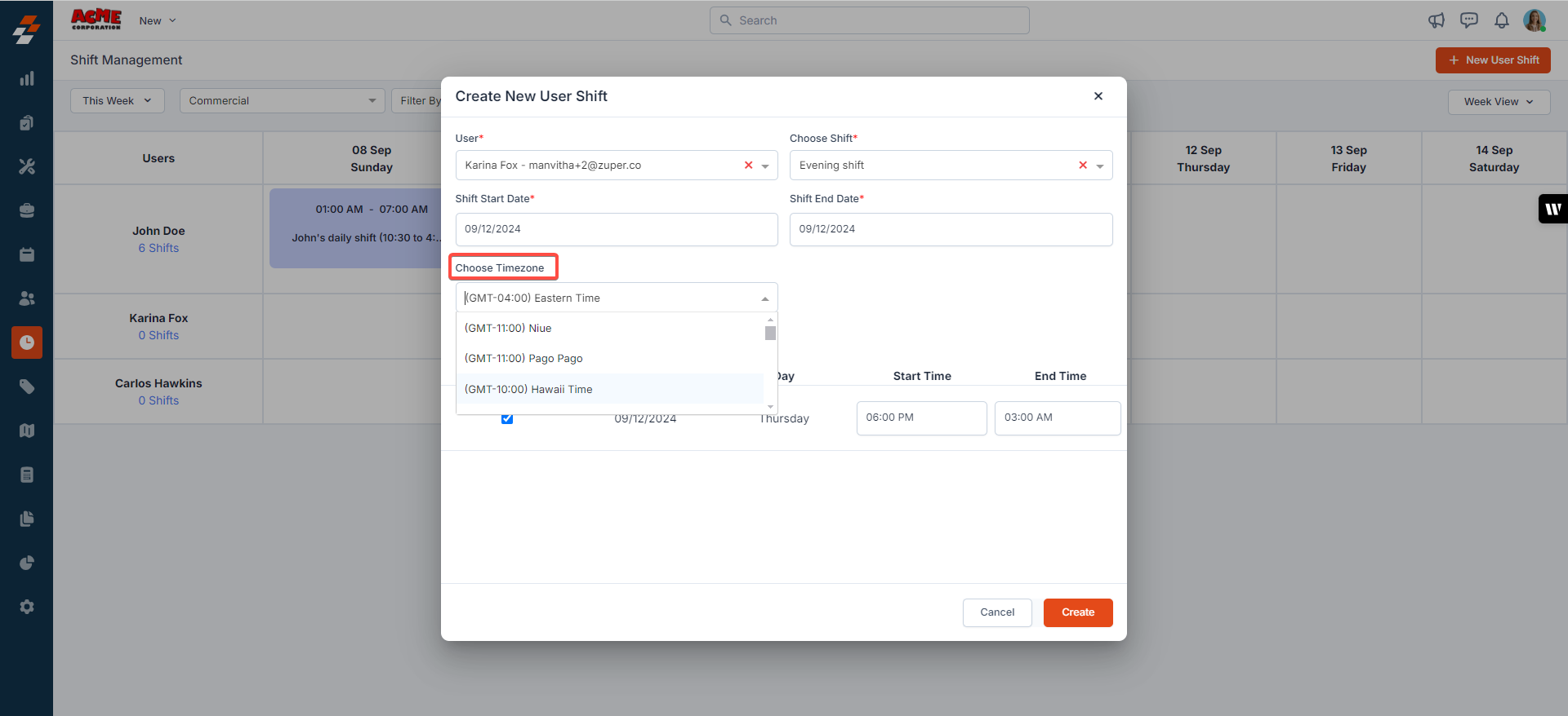You can also create user shifts in a preferred time zone. When creating a shift, simply pick the time zone of your choice.