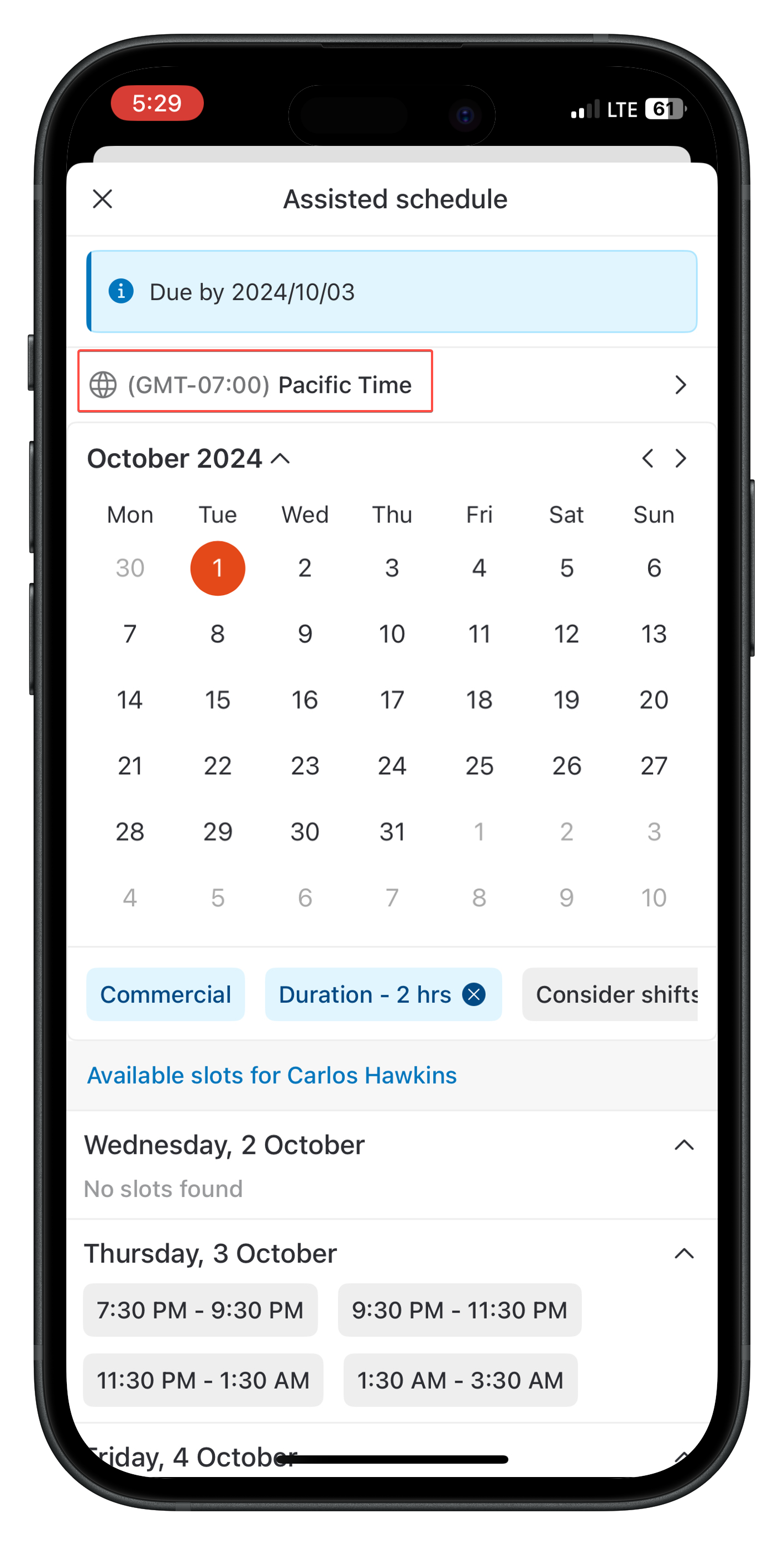 3. Once set, the selected time zone will apply to the Due Date, Start, and End Date & Time. You can also view the start and end times converted to your device's time zone for better clarity. Additionally, you can view Assisted Scheduling slots in your preferred time zone.
