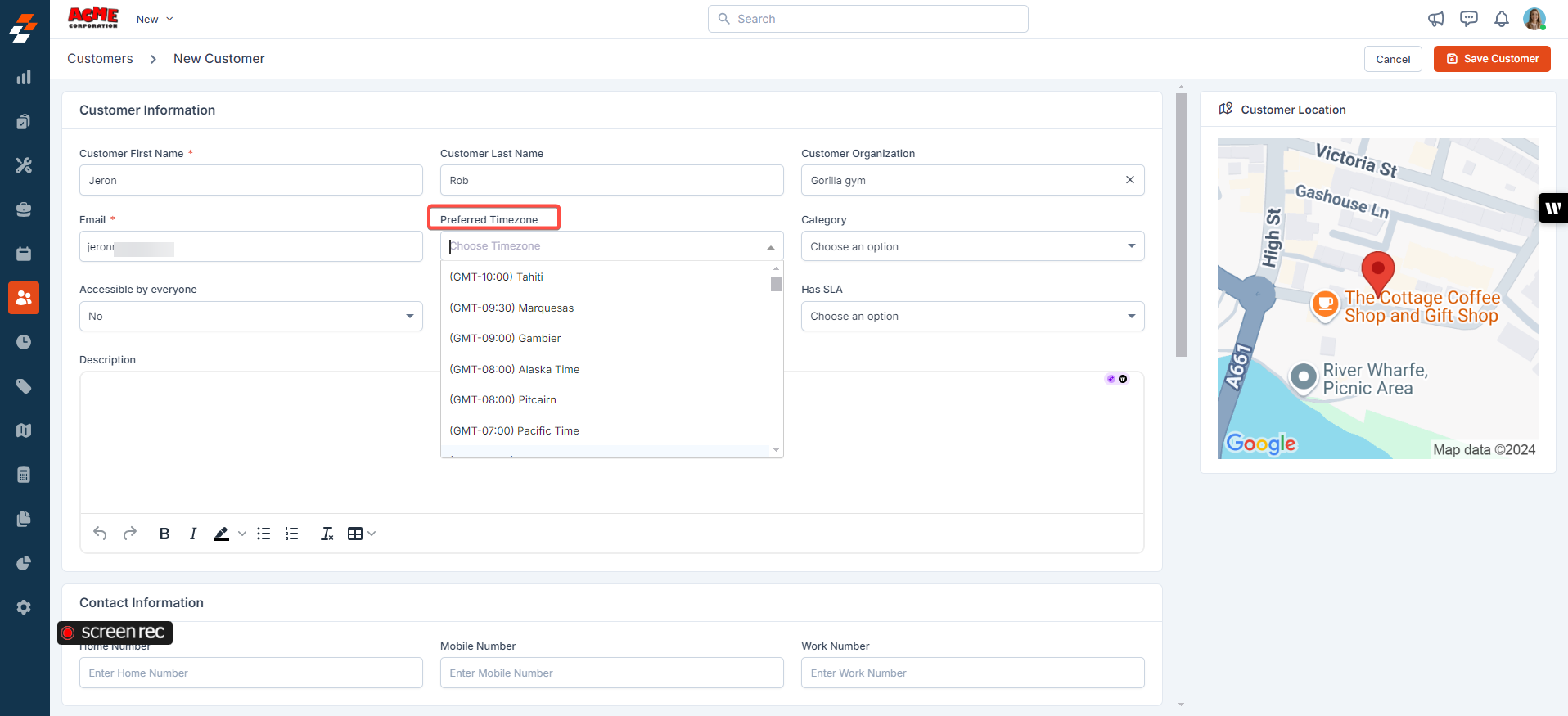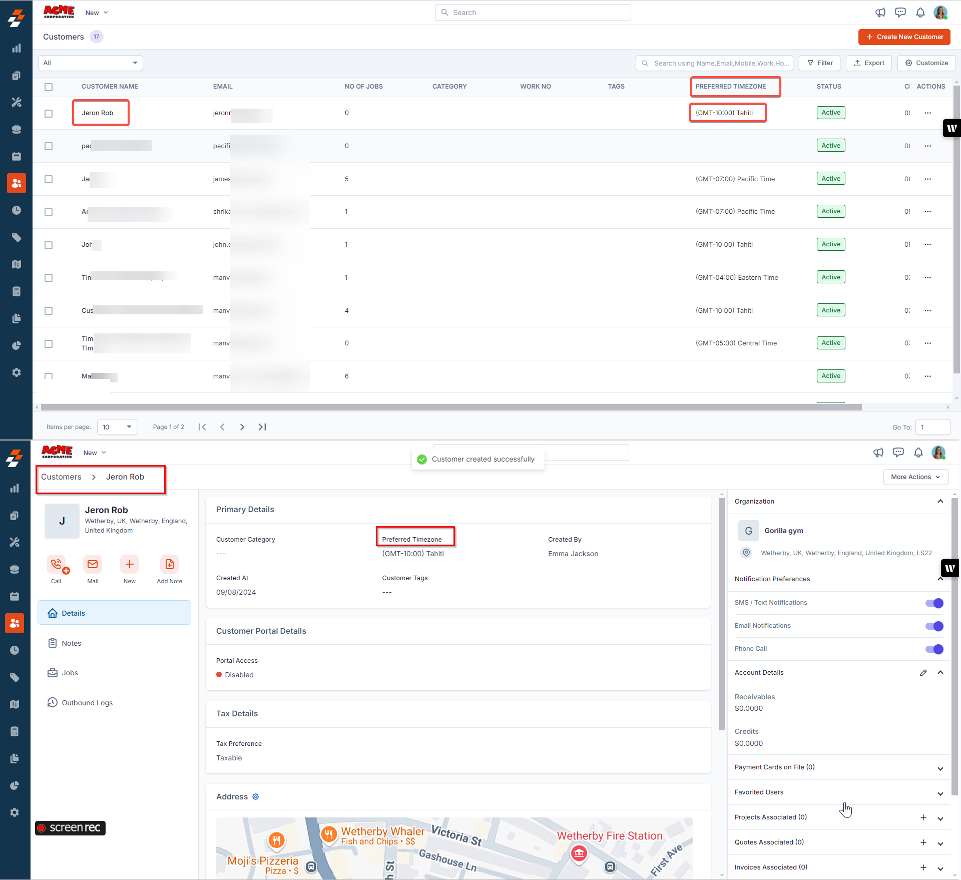 4. After choosing the time zone, you can view it from both the customer or organization details page.