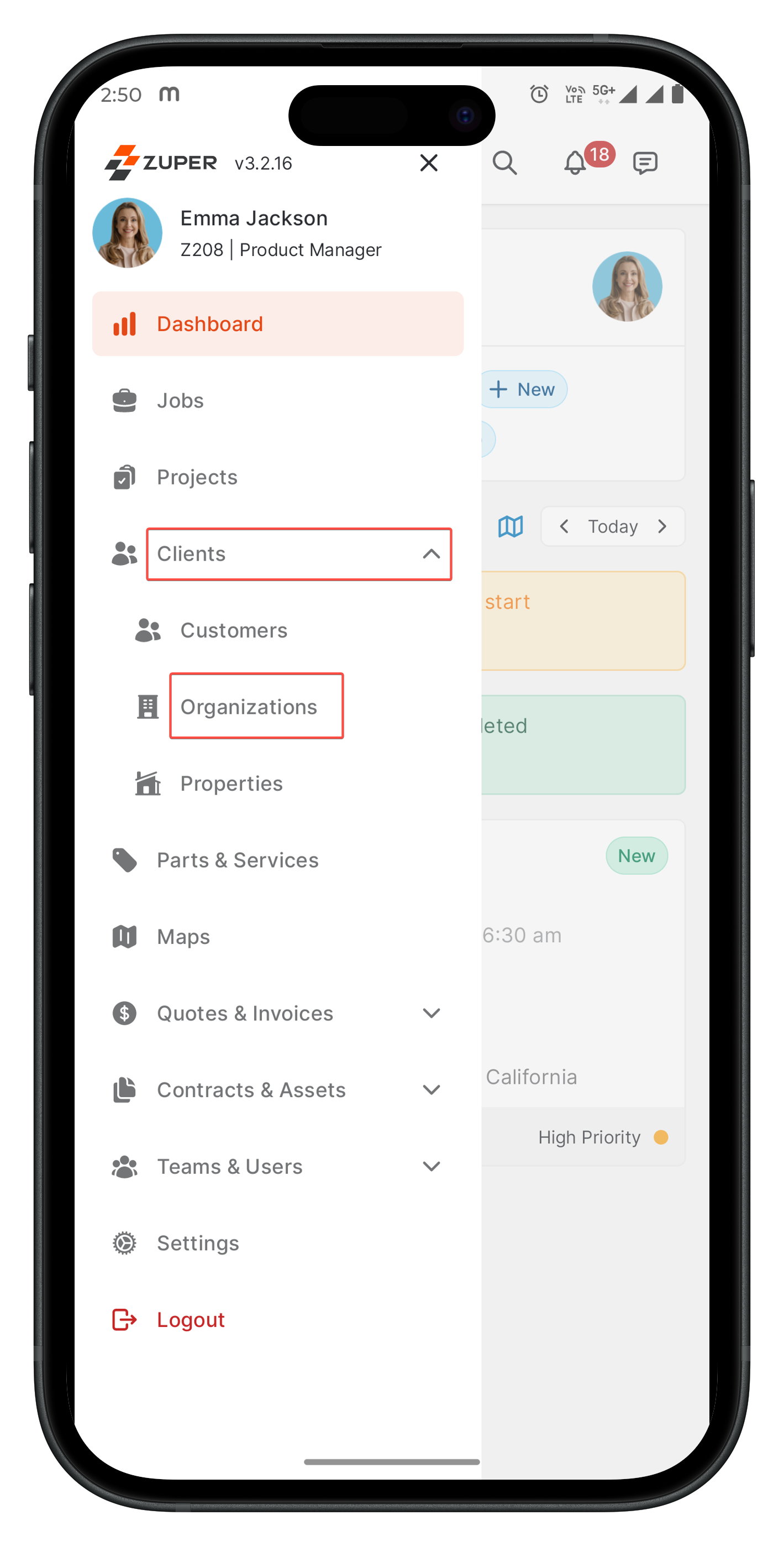 1. Go to the "Clients" module and select Customer/Organization from the top-left hamburger icon.