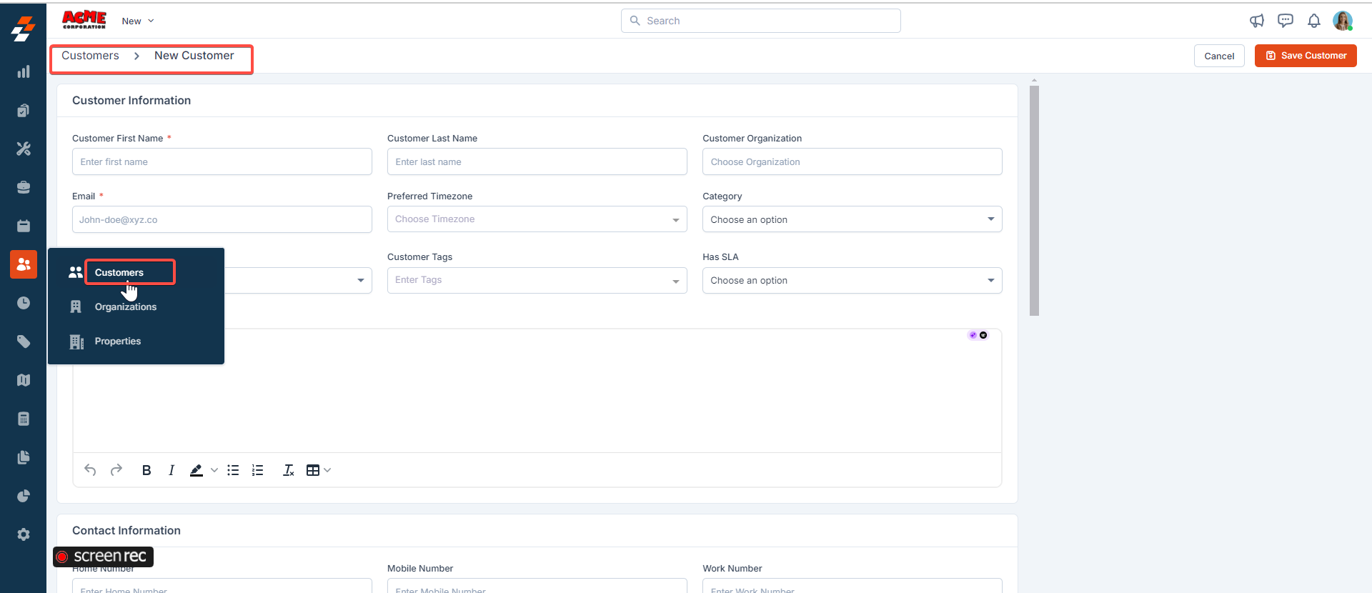 2. Click the “+” icon. A new customer/organization creation page appears.