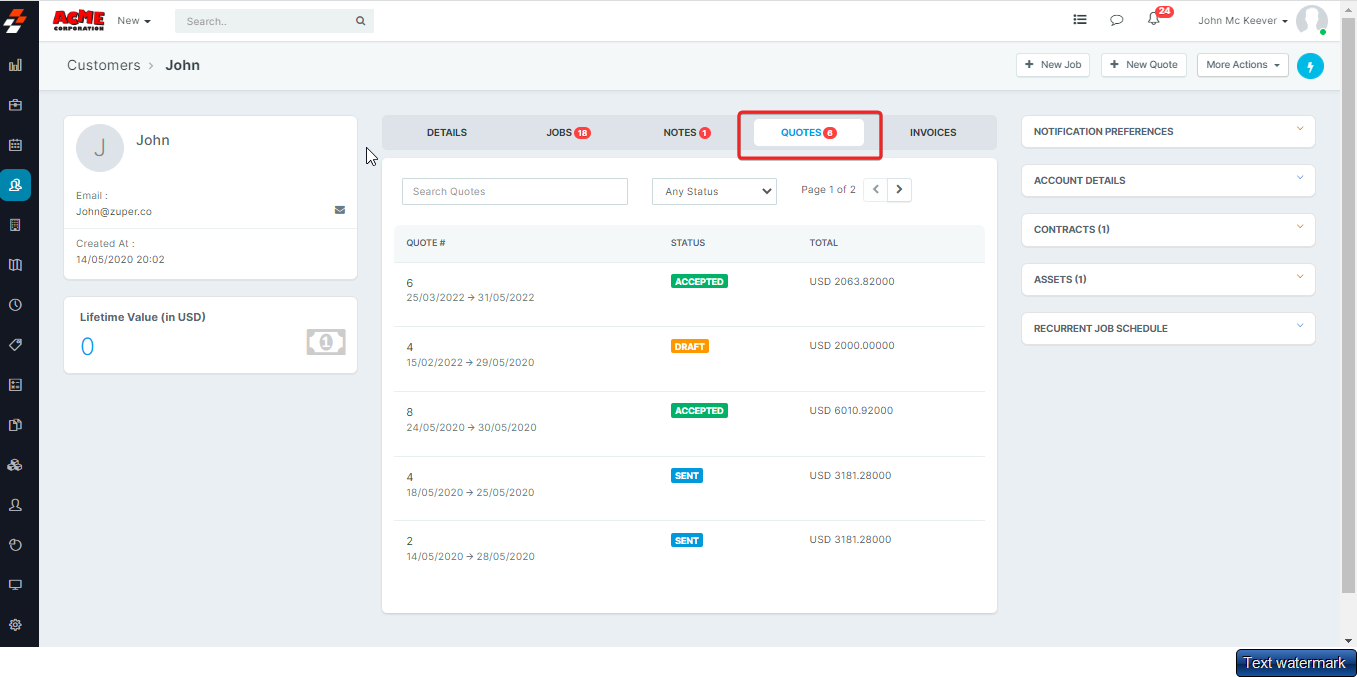- The right pane displays service level agreements and assets associated with that customer. - The middle pane consists of important sections like Details, Jobs, Notes, Quotes, and Invoices