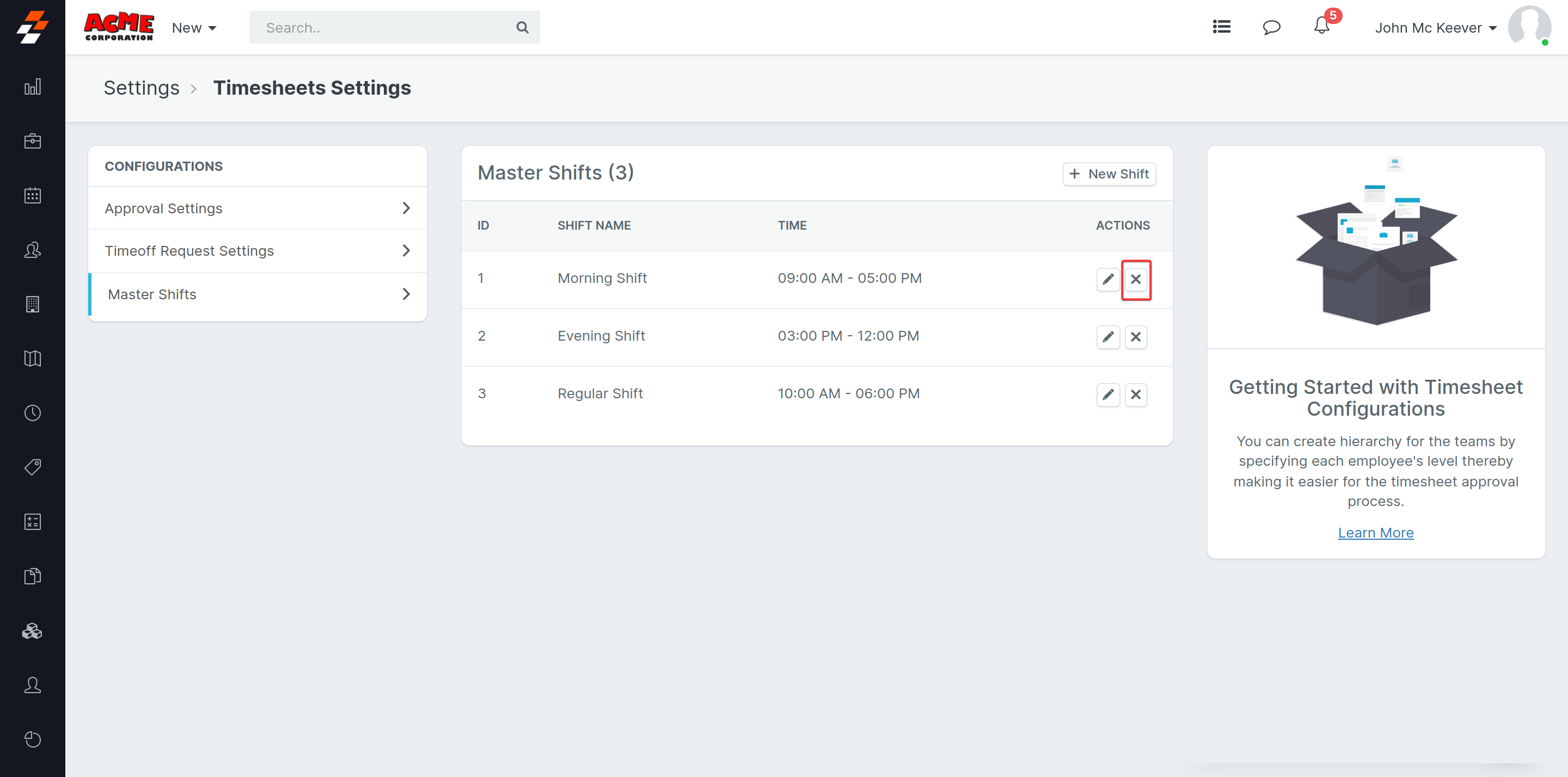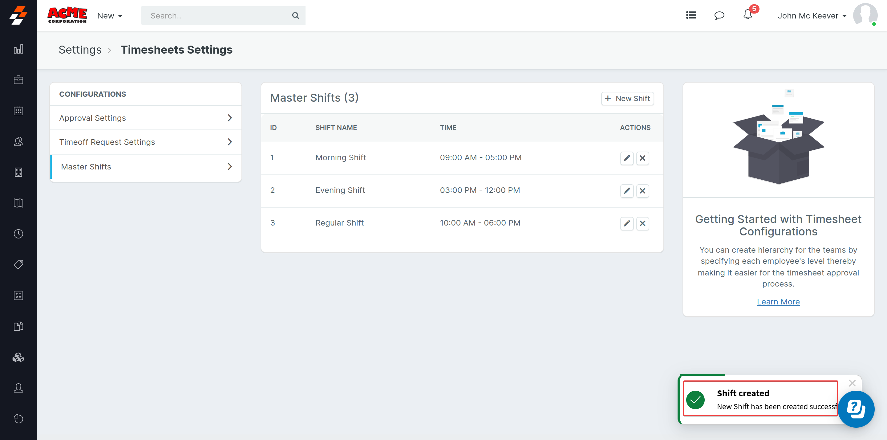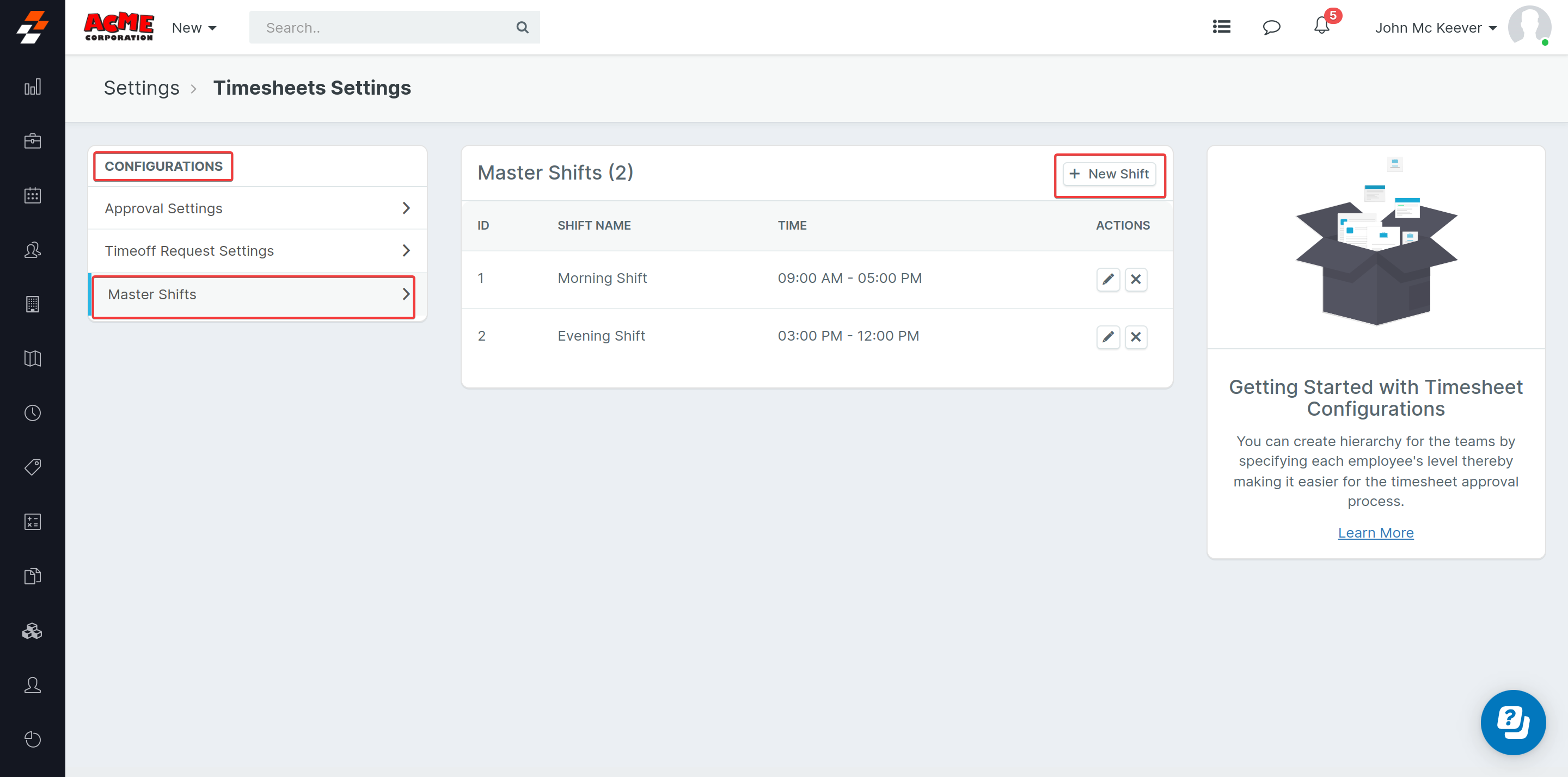 2. Under the “Configurations,” select the “Master Shifts” and choose the “+ New Shift” button.