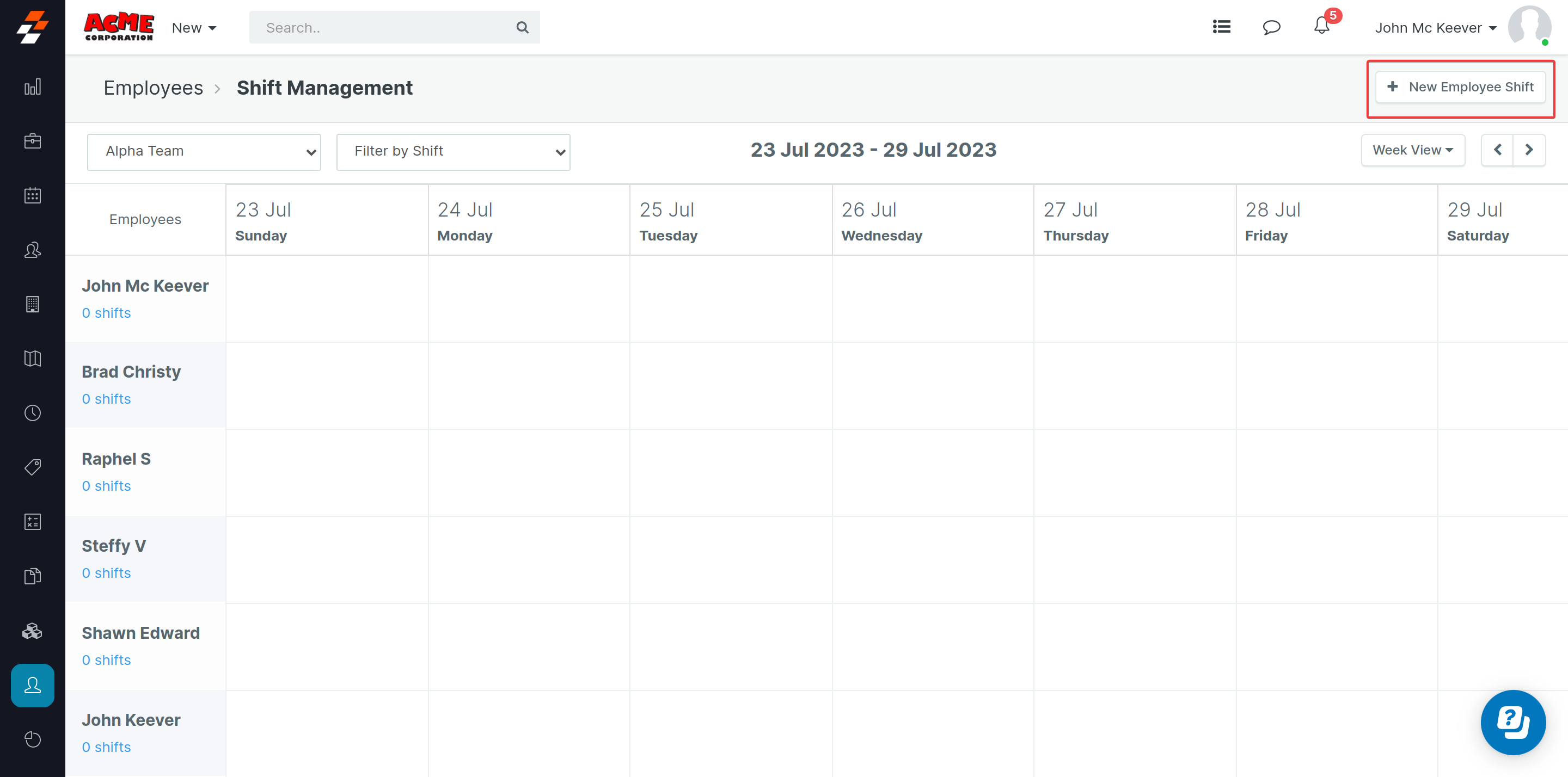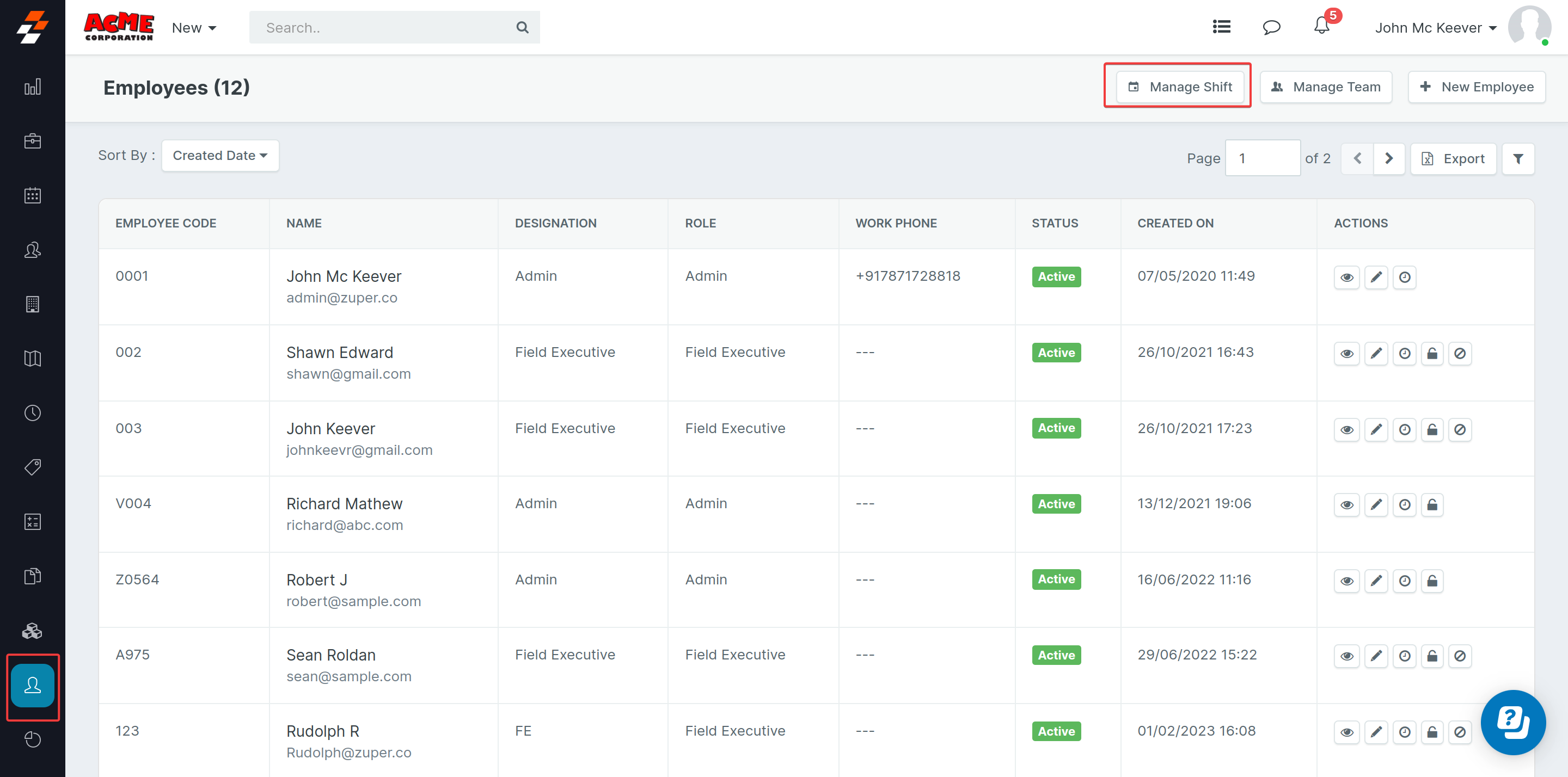 1. Select the “Employees” icon from the left panel and choose “Manage Shift.”