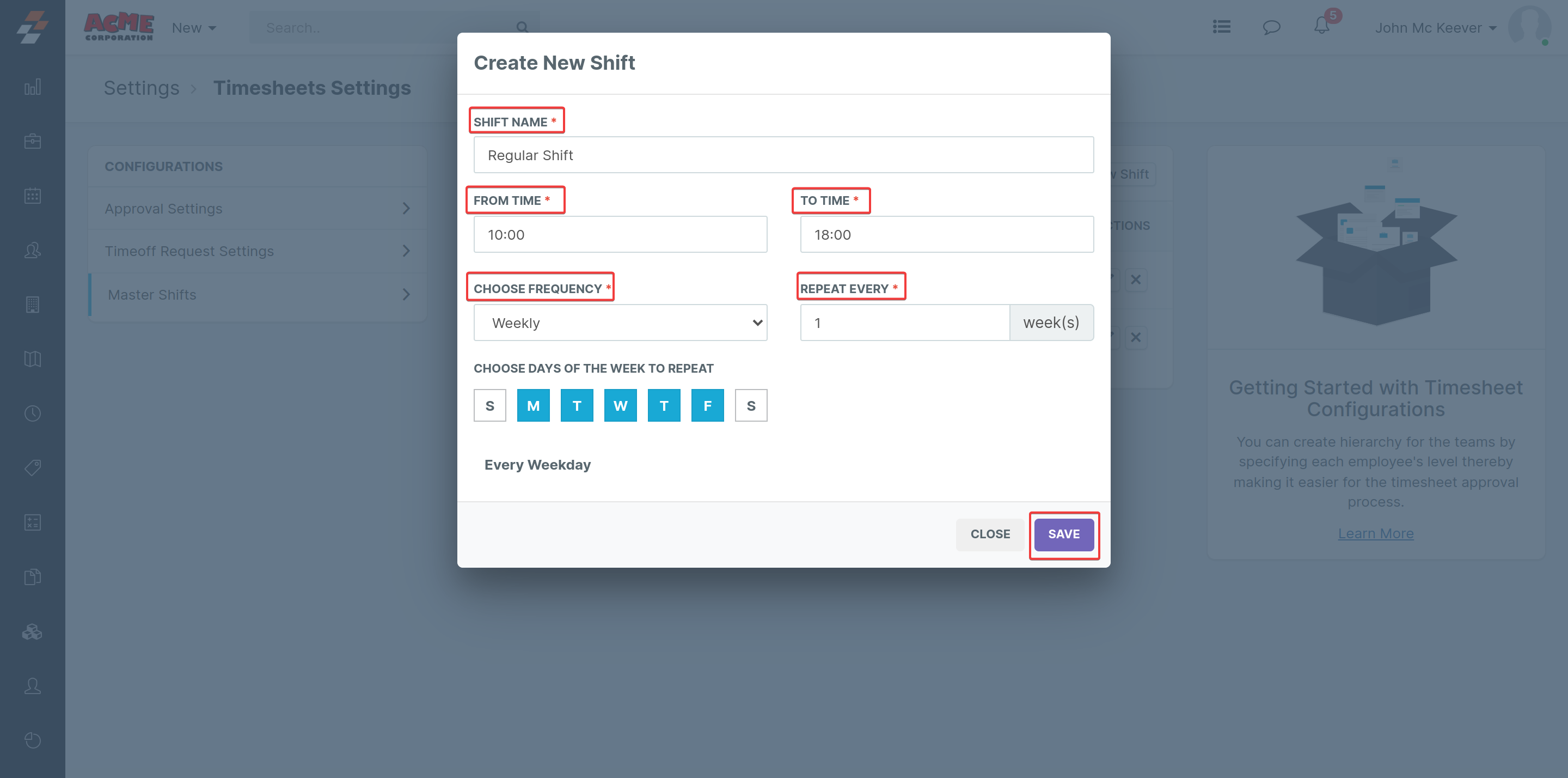 Navigation: Settings -->Configuration Settings --> Timesheet Settings --> Master Shifts