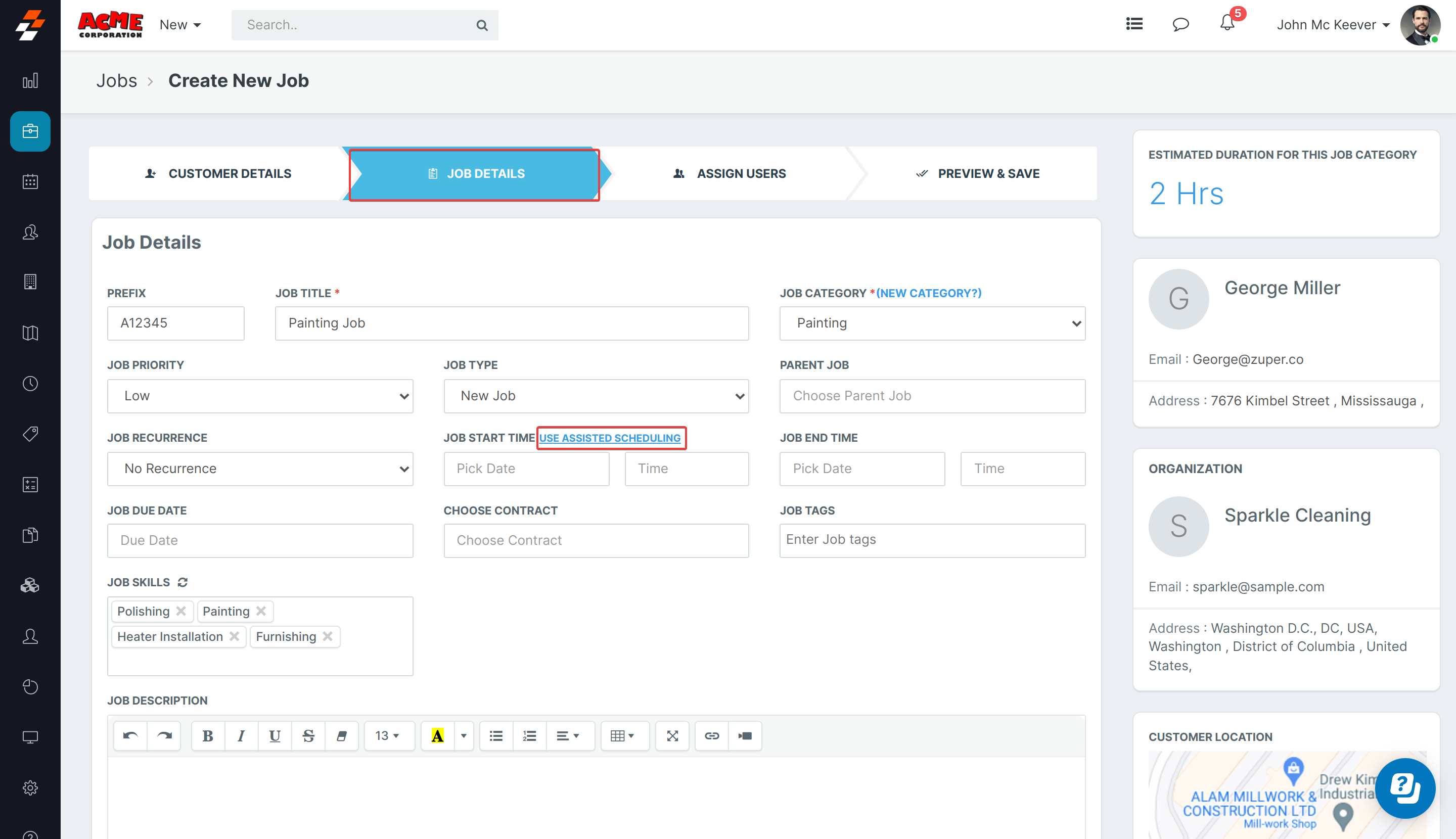 3. Fill in the necessary details under the “Job Details” tab and click the “Use Assisted Scheduling” button.