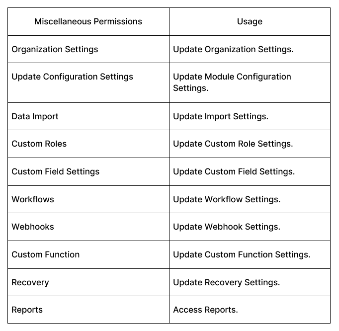 Custom roles now include miscellaneous permissions to restrict access to the Settings page, reports, workflows, etc.