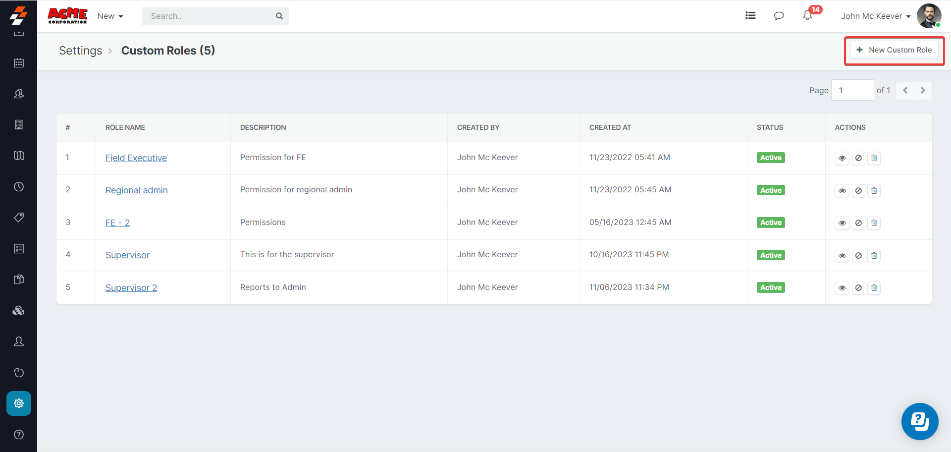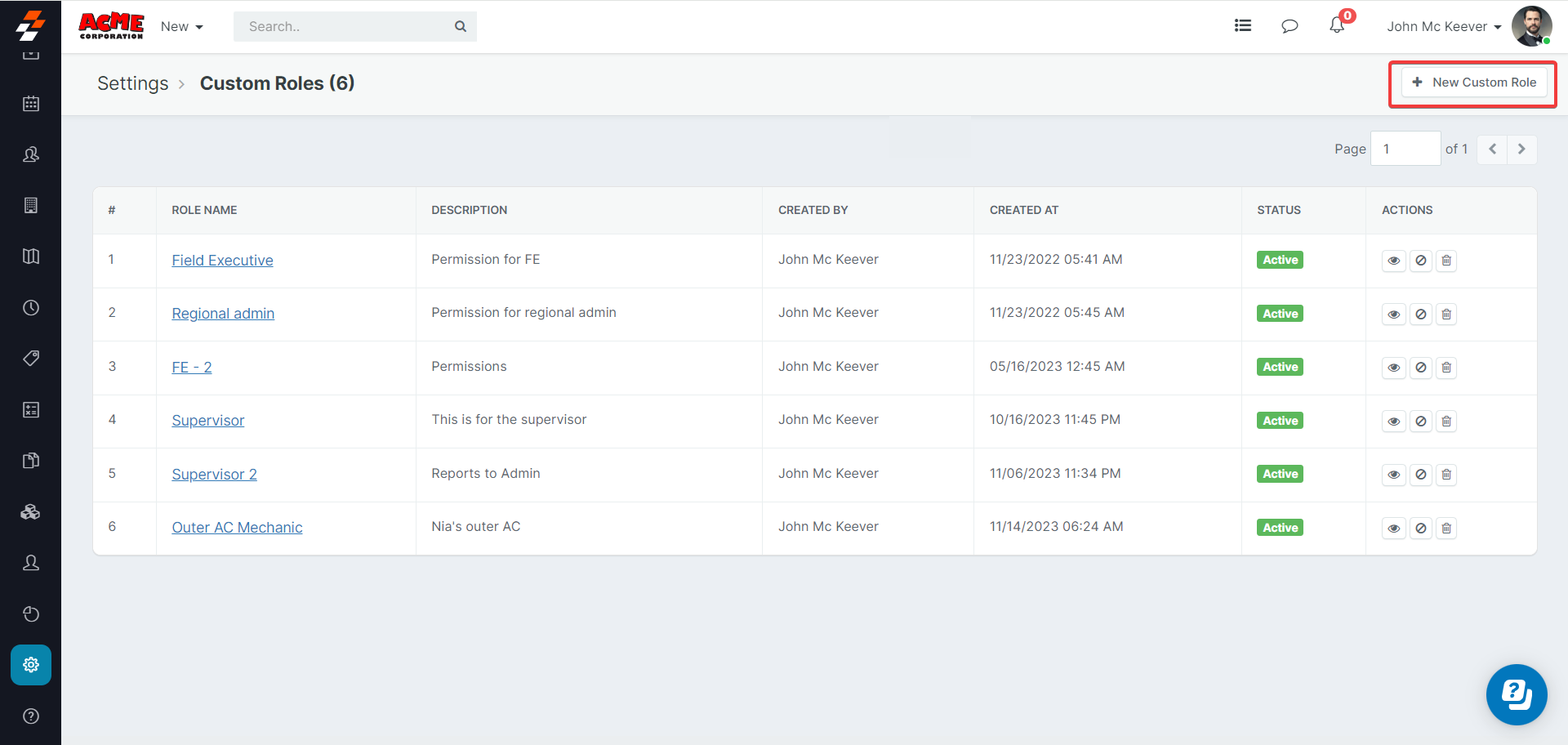 - The existing roles will be visible on the dashboard. Click on the "Eye" symbol under Actions to view or update an existing role.