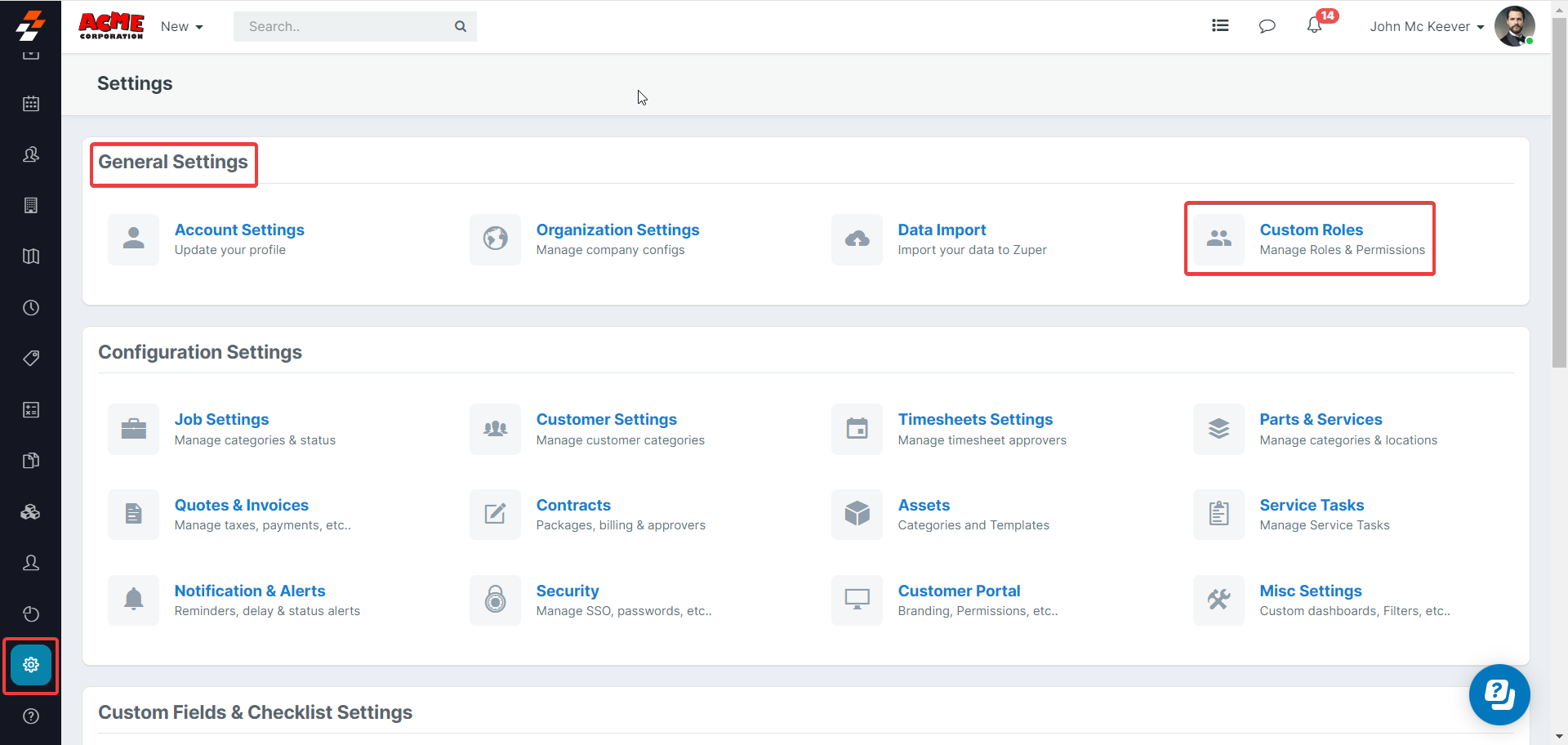 1. Select the “Settings” icon from the left navigation menu. Under the “General Settings,” Choose the “Custom Roles” section.