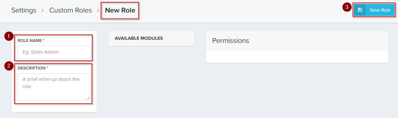 The custom roles are created to define user-defined functions. The user can set various permissions for accessing multiple modules. 1. Select the “Settings” module from the left panel and click the "Custome Roles" section. 2. Click the “+ New Custom ...