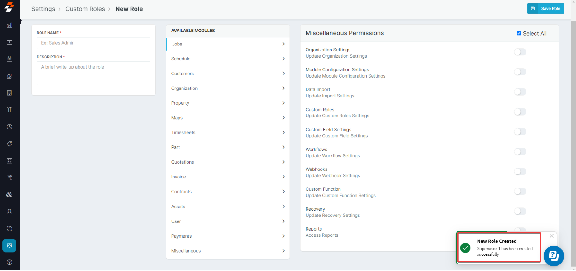 Navigation: Settings --> Custom Roles The various permissions are set across the modules. Based on the settings enabled by the admin, the field executives or supervisors can View and edit the controls. These are the modules we have enabled the ...