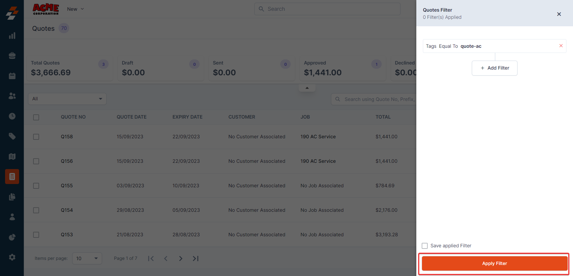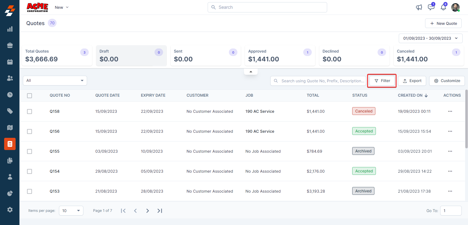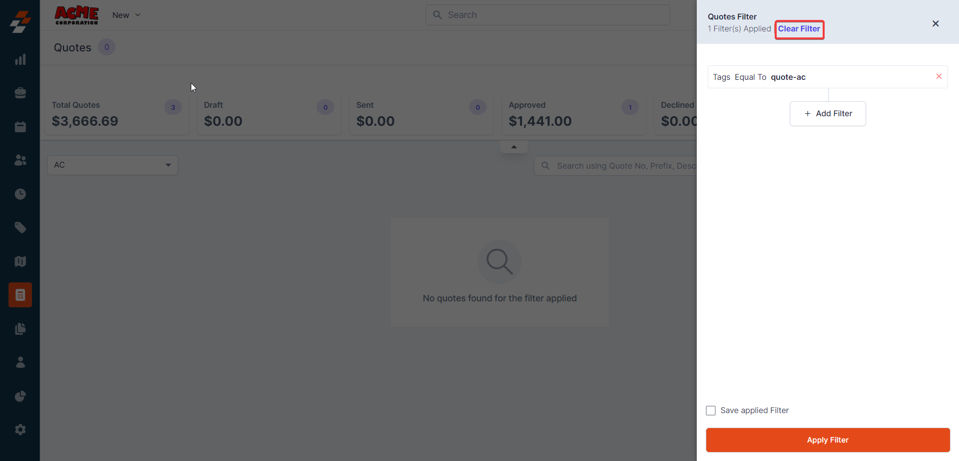 filter icon to filter the quote module details.