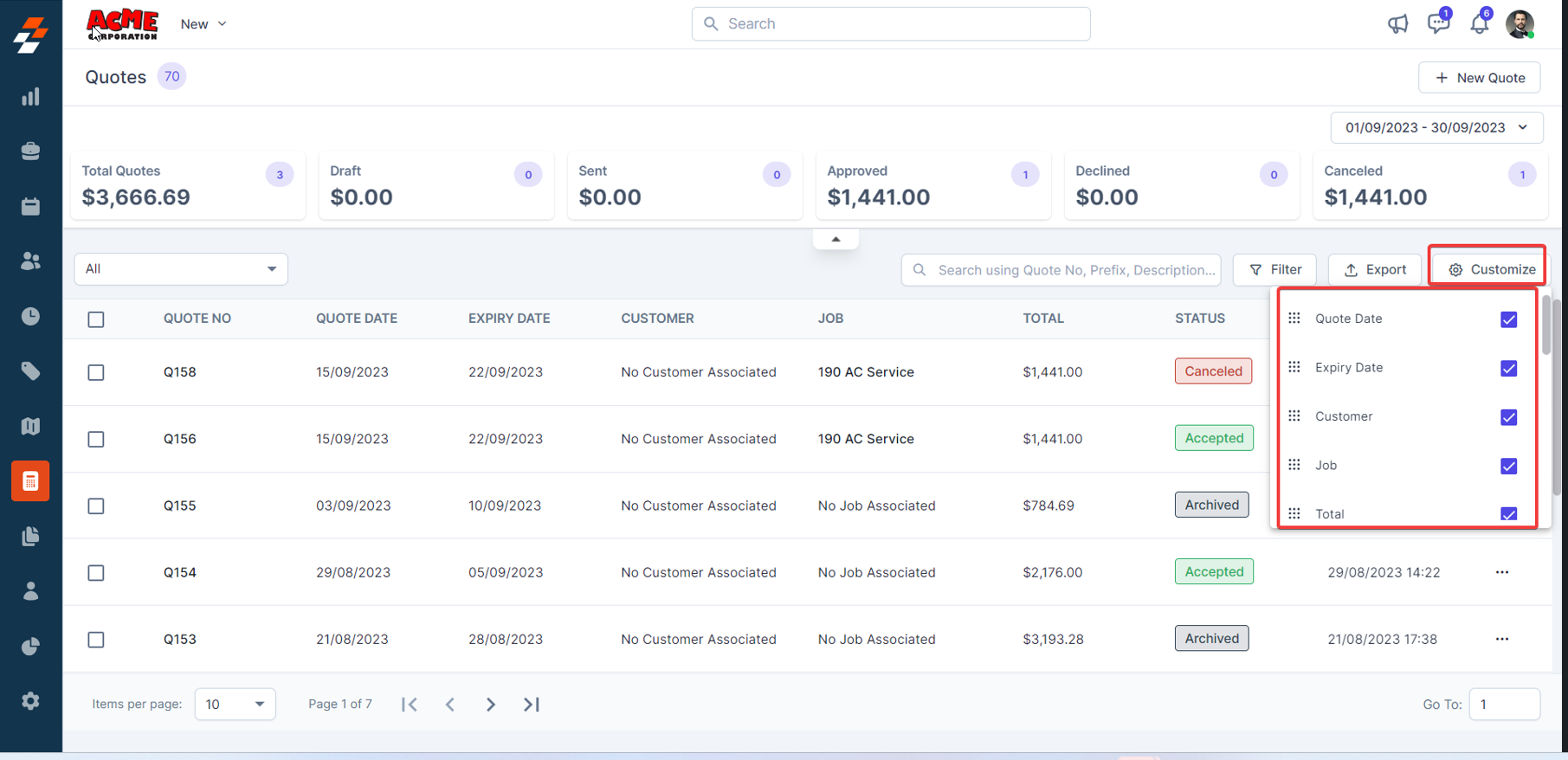 can click on the column names such as ‘Quote No’, ‘Quote Date’, ‘Created Date’