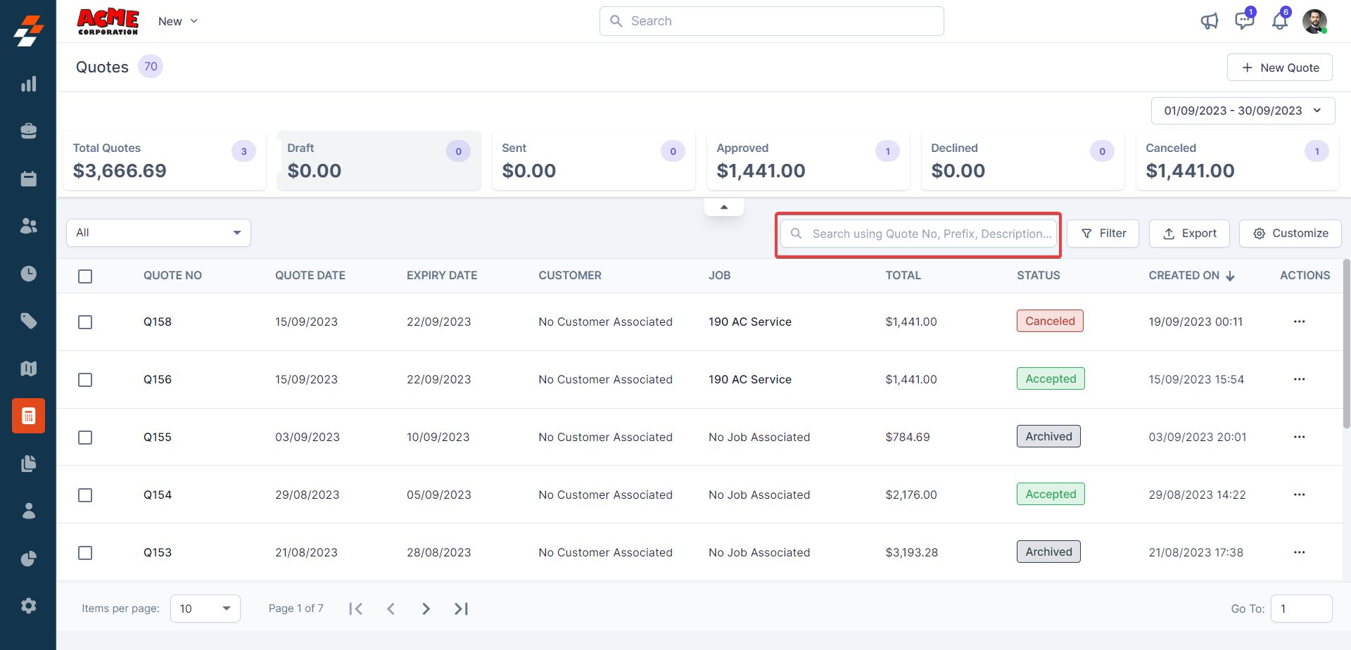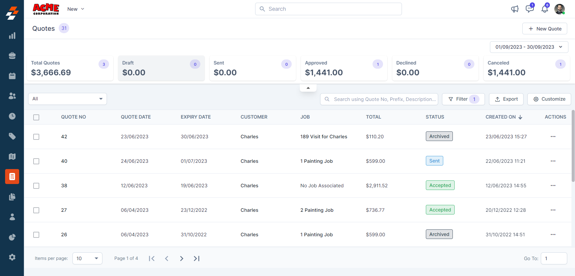 Zuper's Quotation listing page helps manage quote information in one place for more efficient operations.