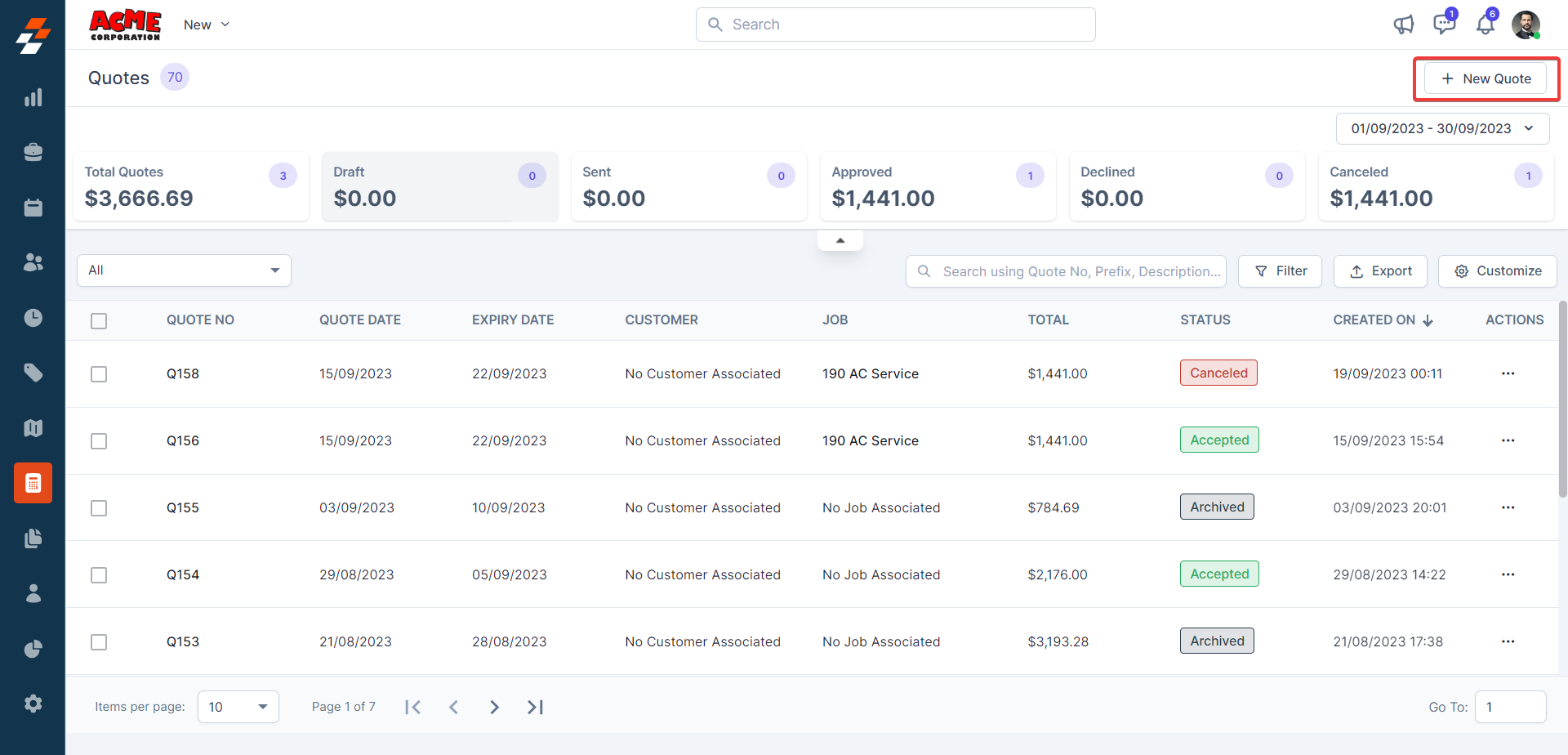 8. Click the "+New Quote" button to create a new quote.
