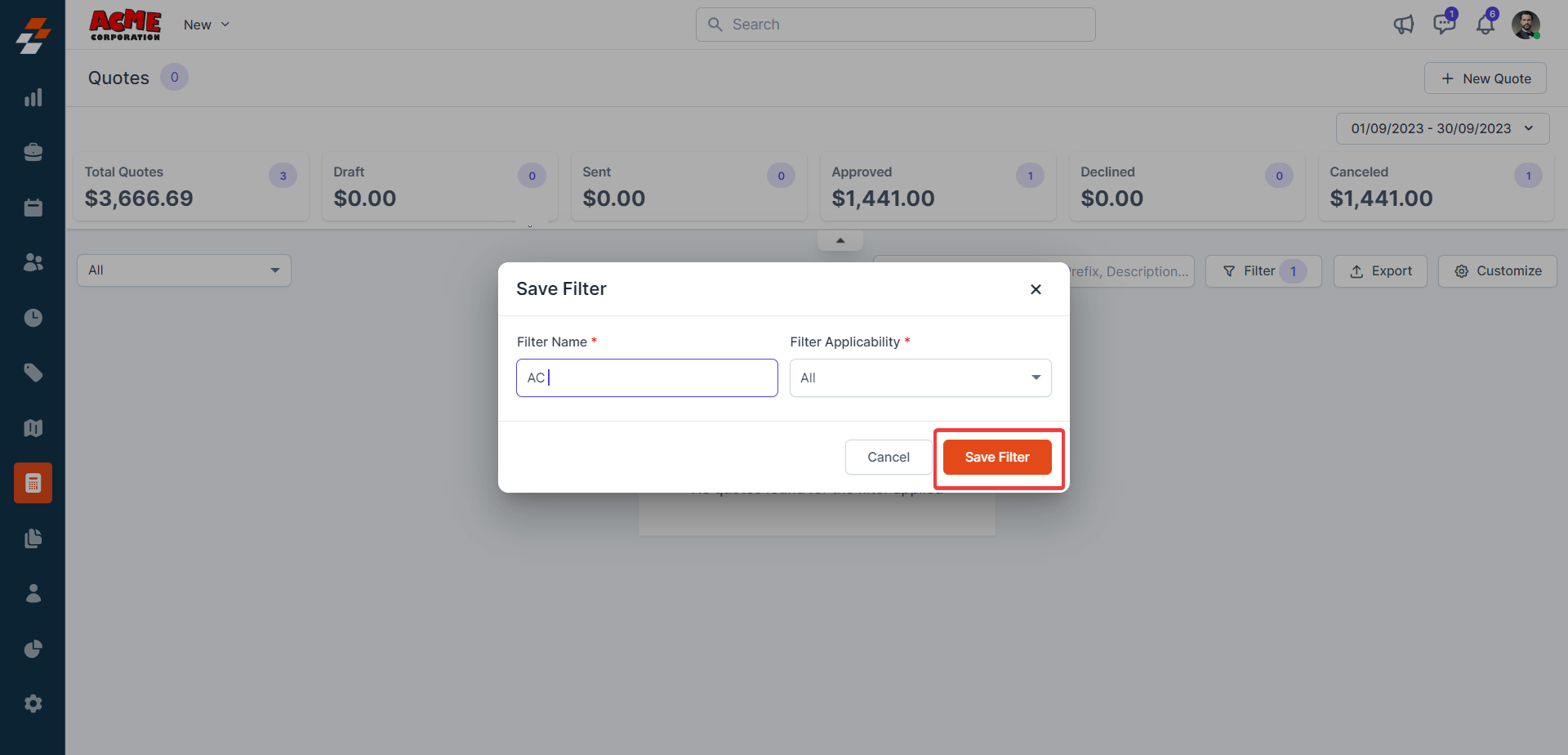 Click the "Save Filter" button to create the quick filter.