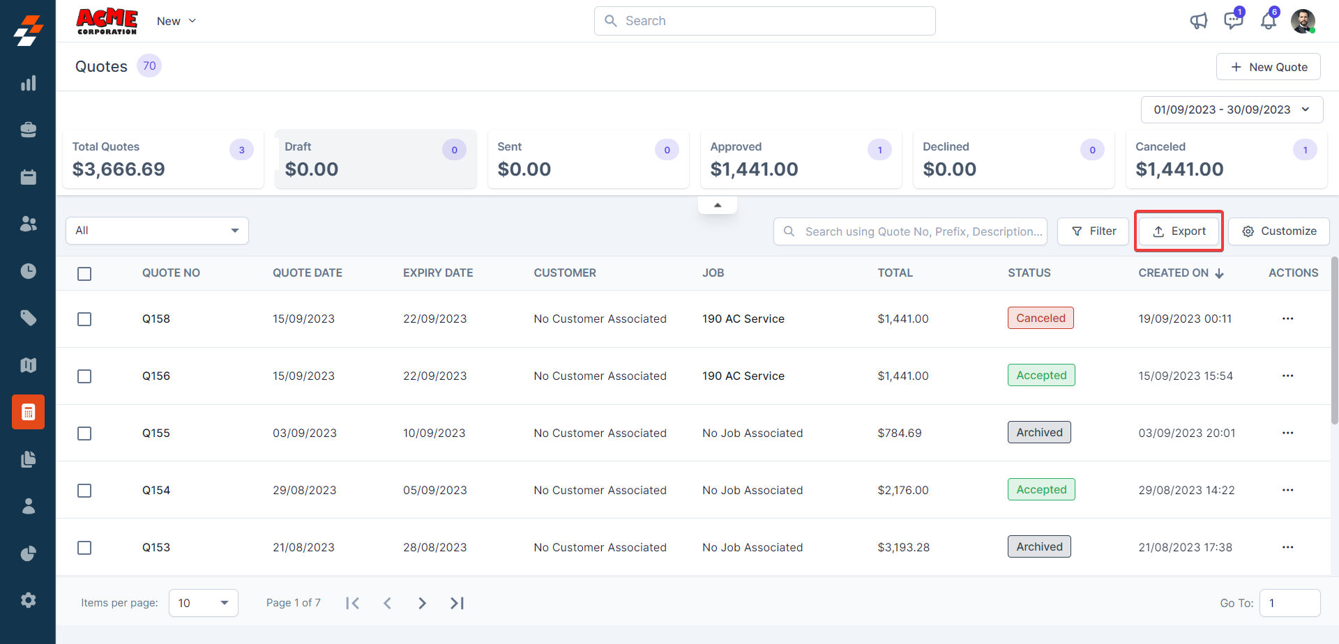 6. Click the "Export" button to preview and download the Quotations Report as an Excel file.