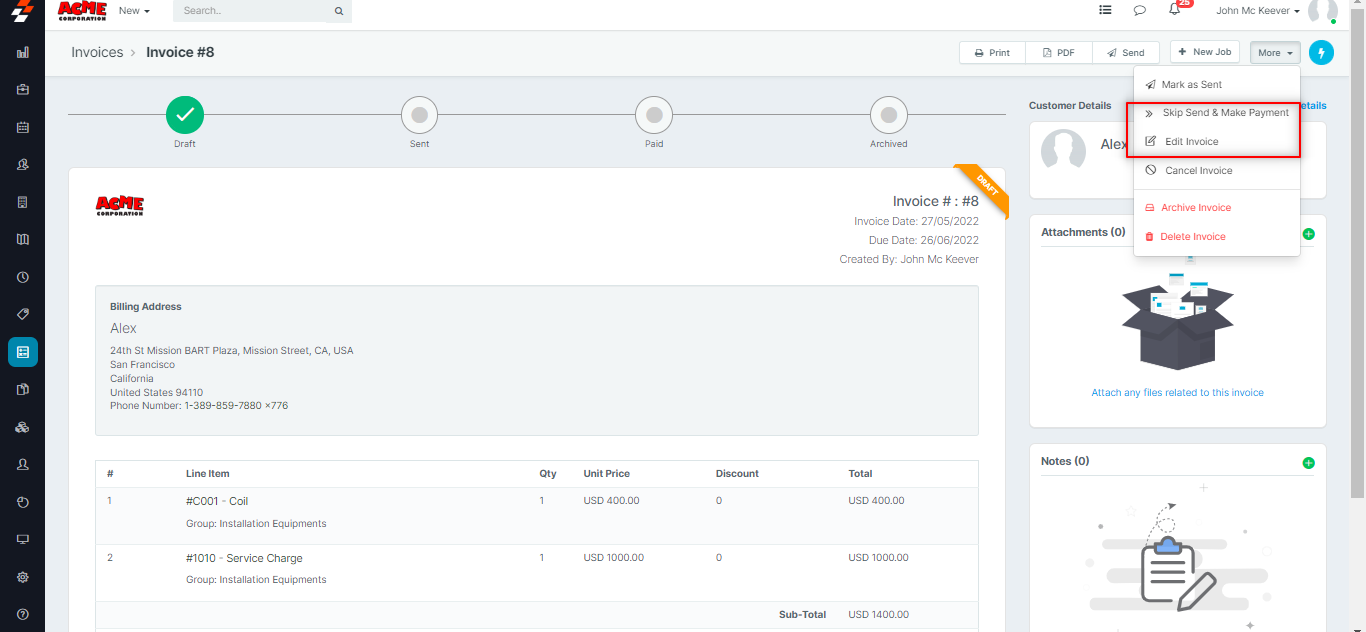 An invoice is an accounting document that field service businesses send to their clients to request payment for the services rendered. An invoice can be marked as paid as and when the customer pays the Invoice. An invoice, once sent, can be marked as ...