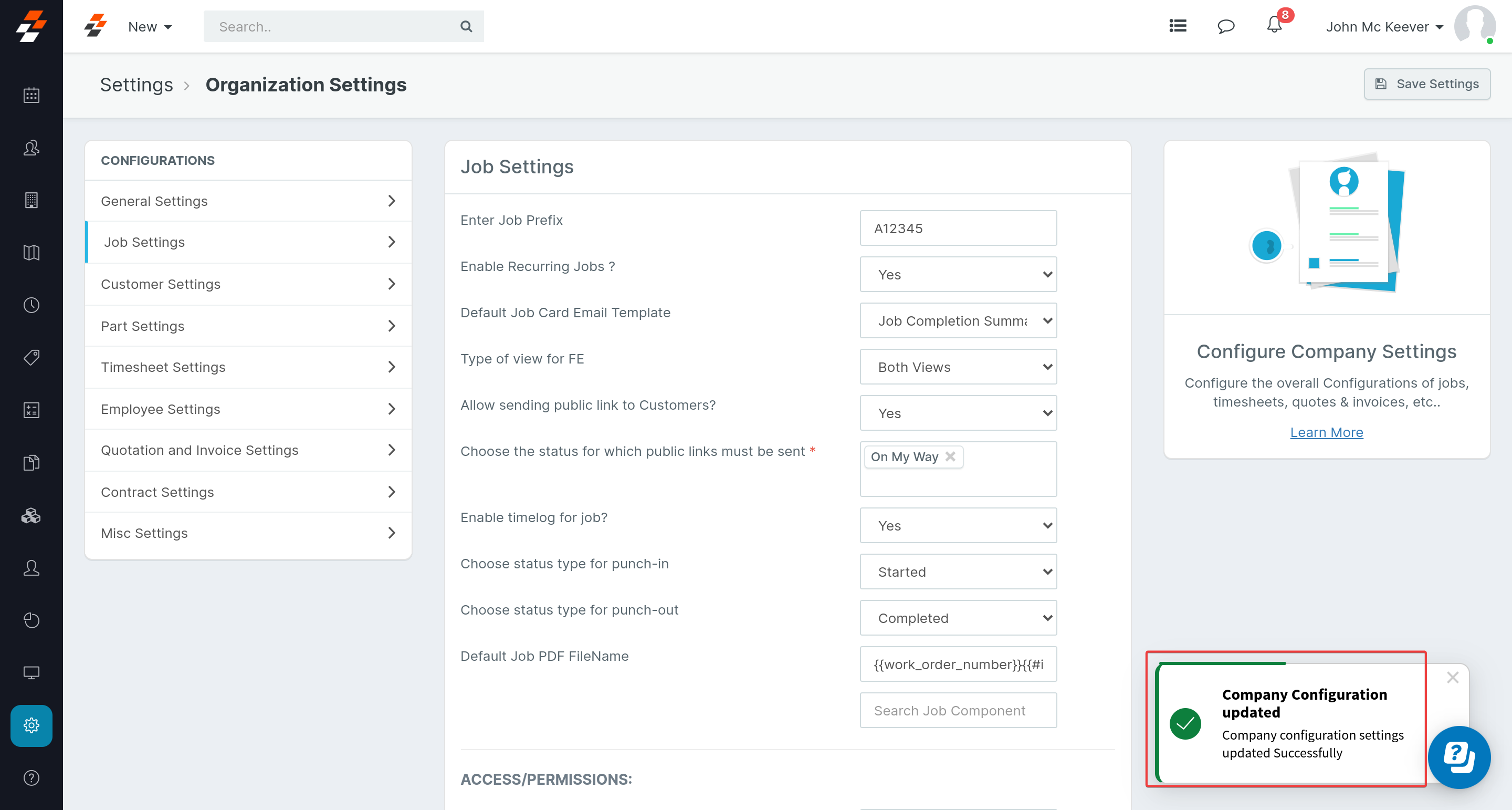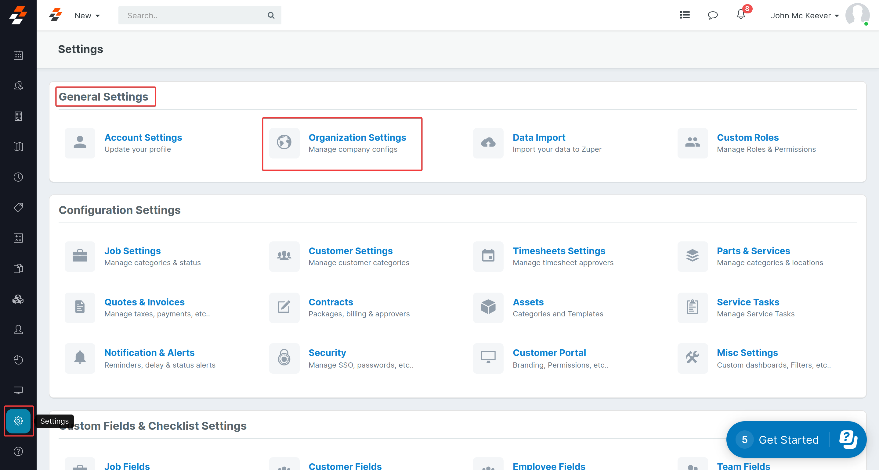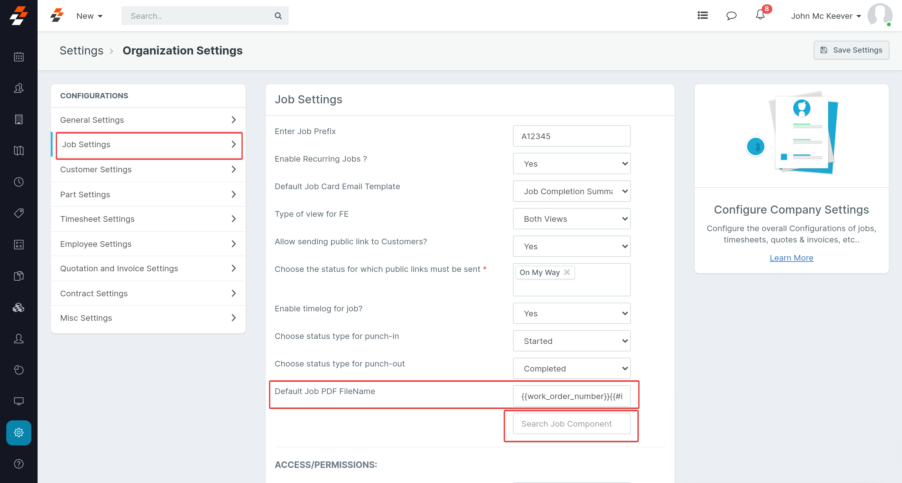 Navigation: Settings -->Organization Settings --> Job Settings --> Default Job PDF Filename1. Select the “Settings” icon from the left panel. Under “General Settings,” choose “Organization Settings.”