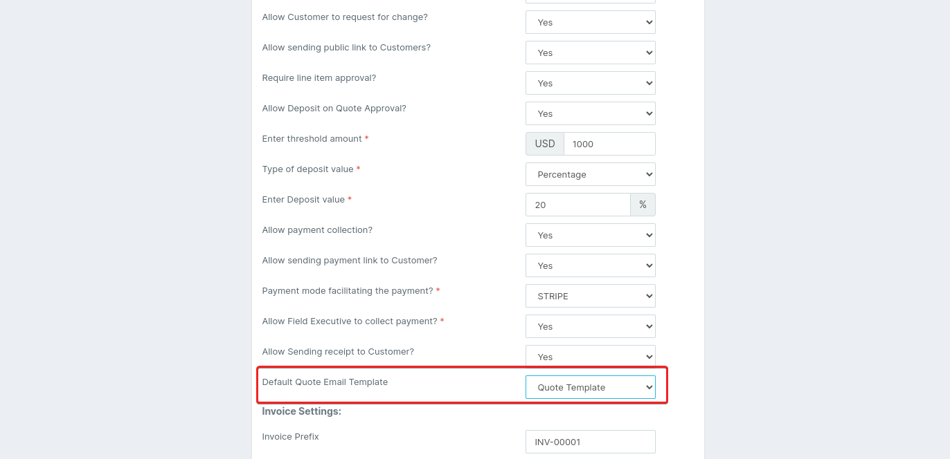“Quotation and Invoice Settings,” scroll to enable/disable the default quote email template option