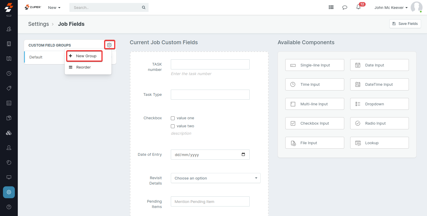 1. Select the “Settings” module from the left navigation menu, choose the “Custom Fields & Checklist Settings,” and select the “Job Fields” section.