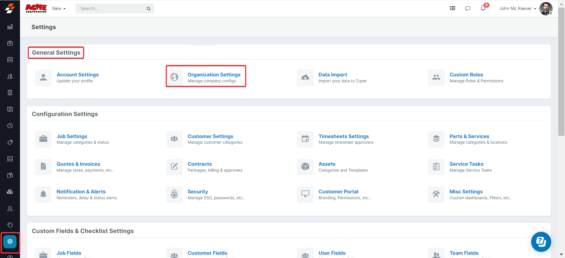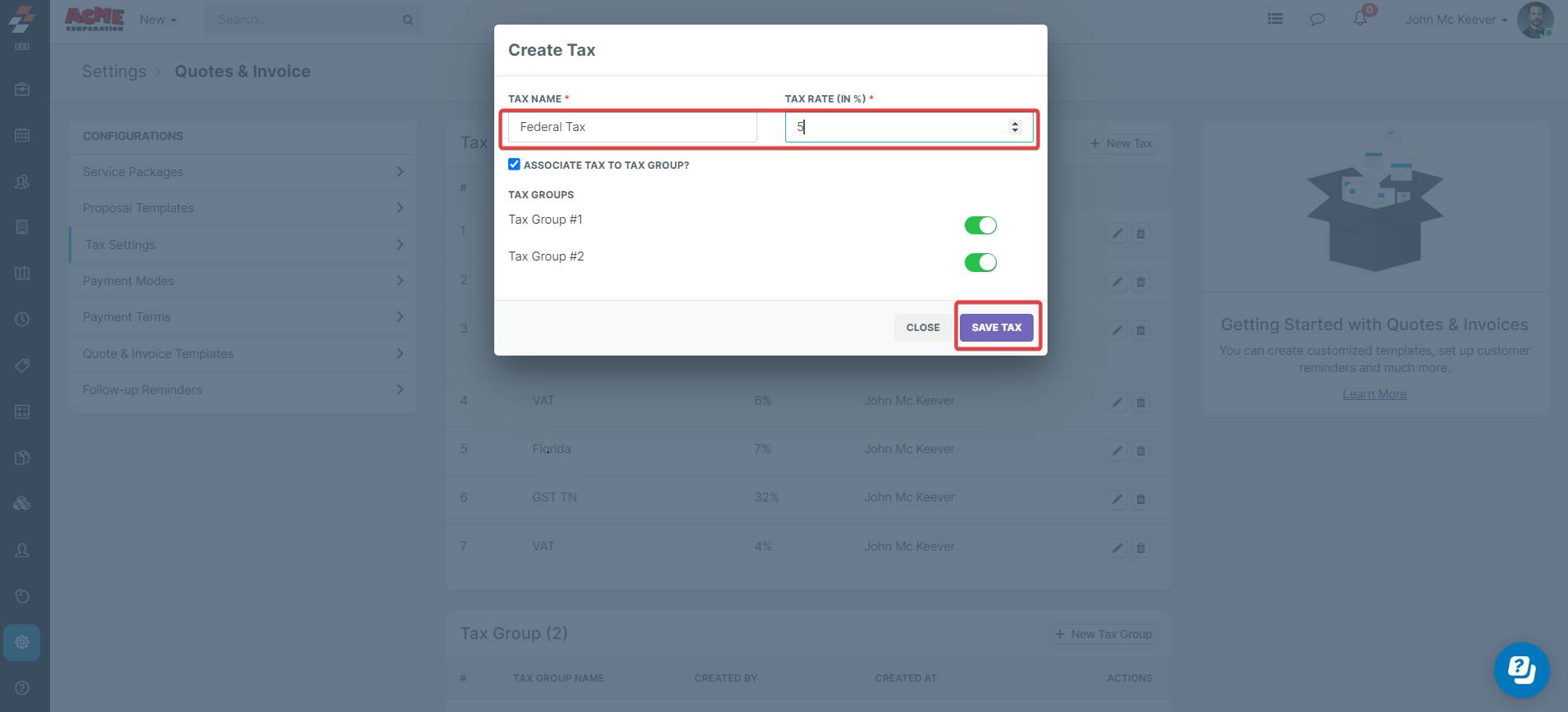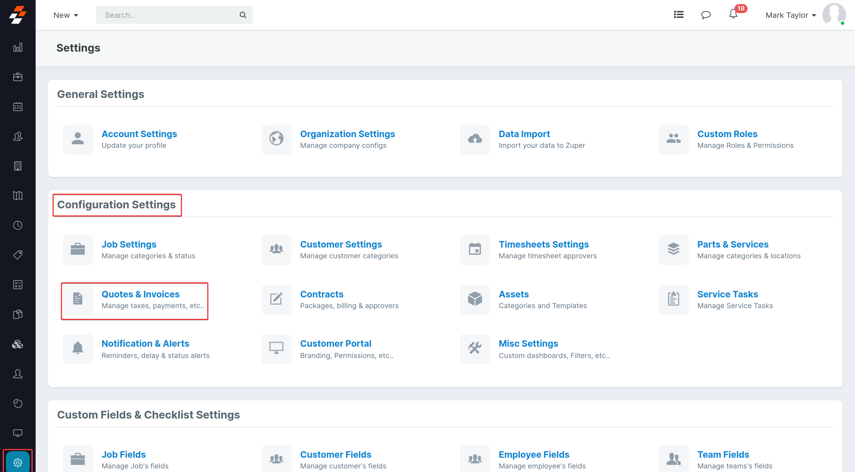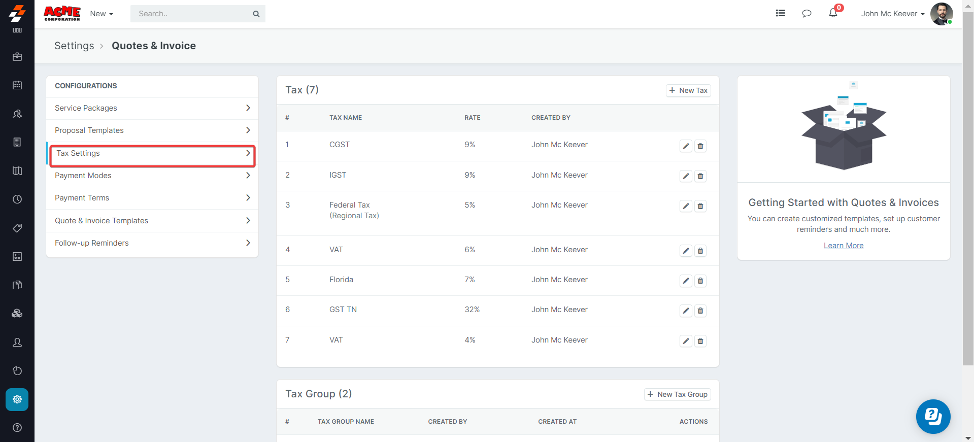 Settings --> Configuration Settings -->Quotes and Invoices --> Tax Settings --> +New Tax1. Select the “Settings” icon from the left navigation menu.
