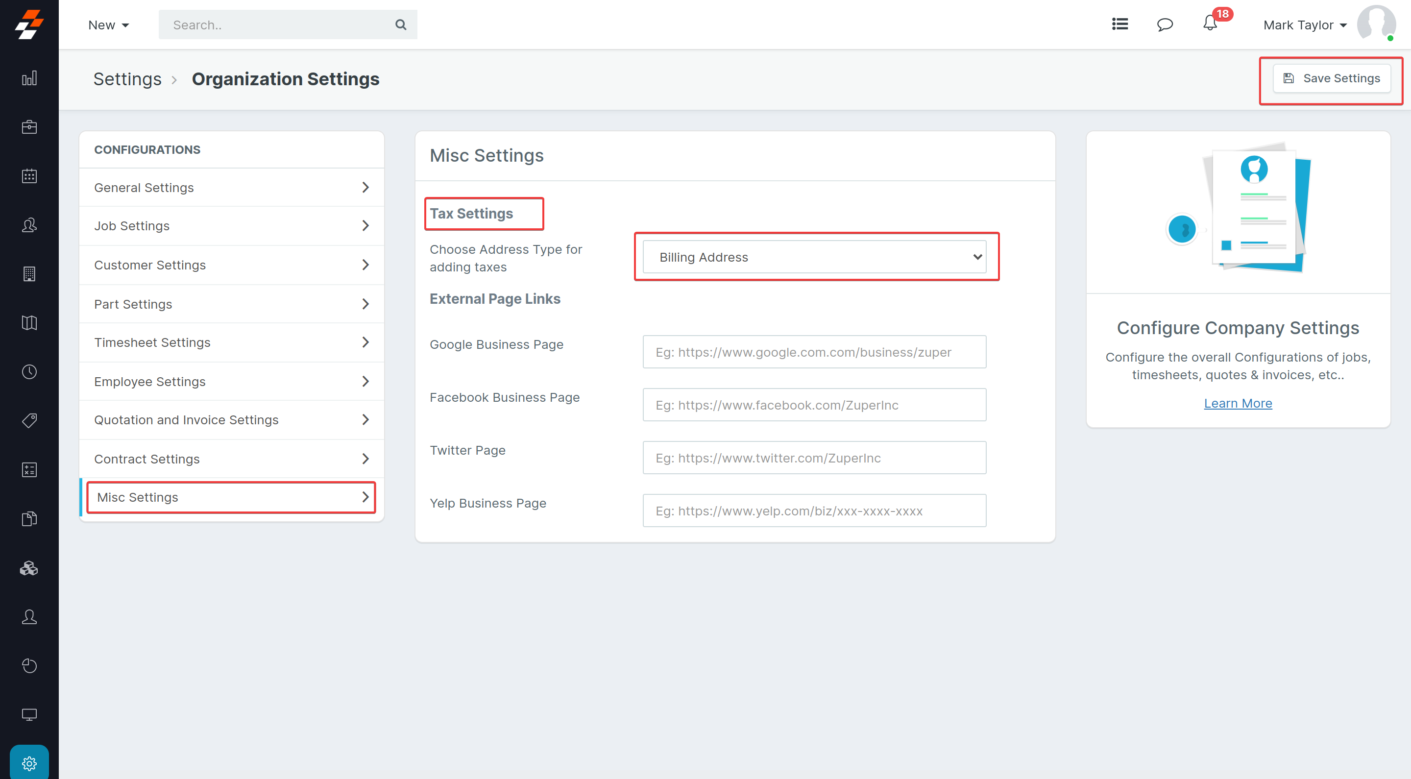 Navigation: Settings --> Organization Settings -->Misc. Settings --> Tax Settings