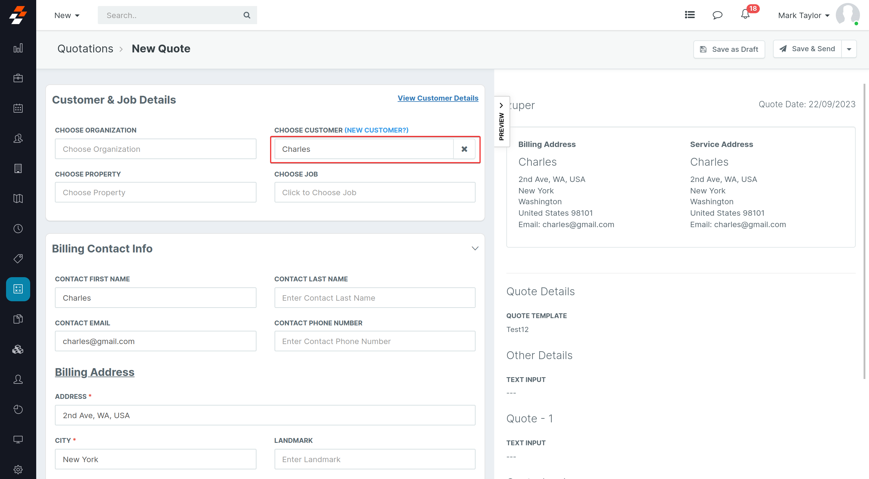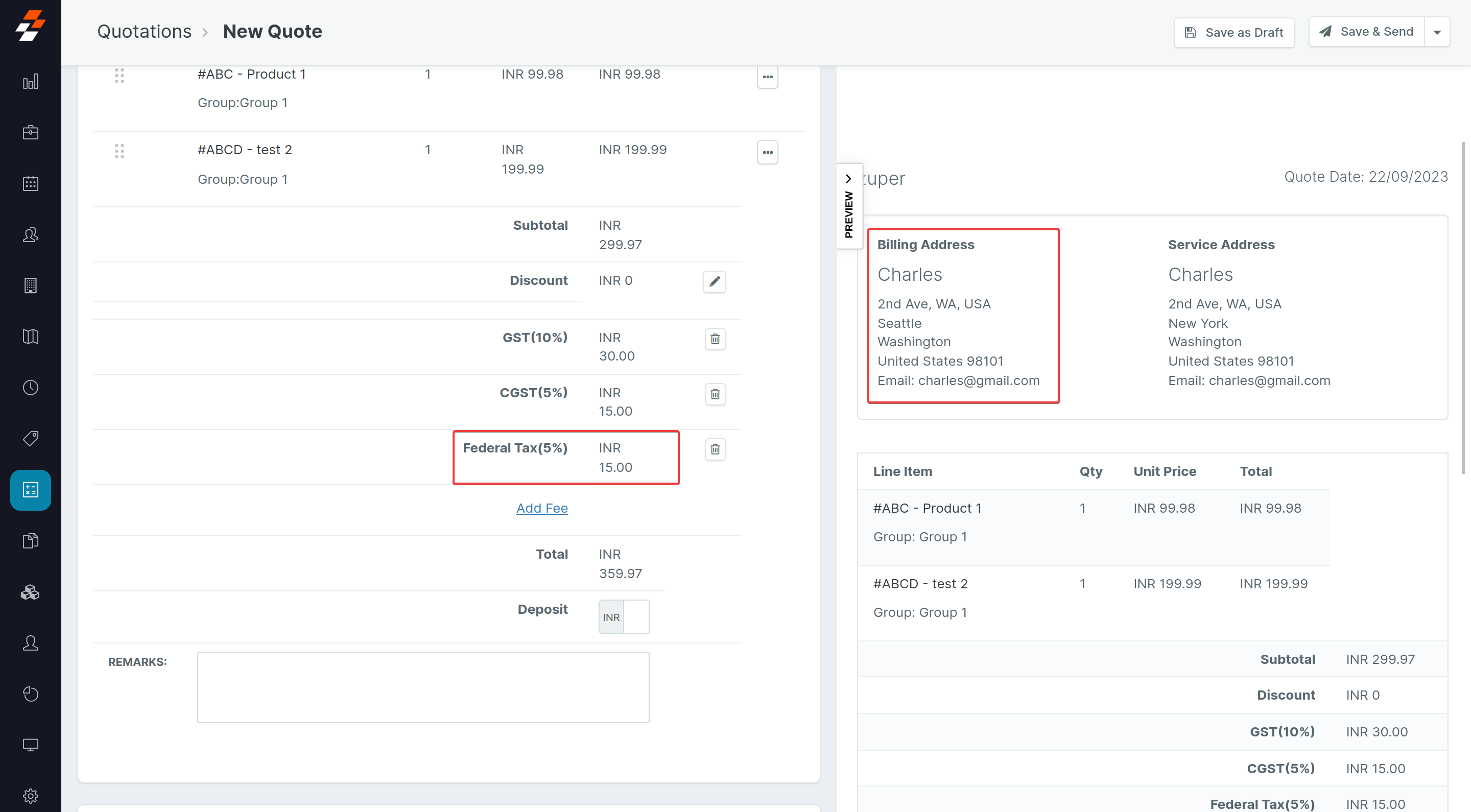 You need to pre-define the address to apply the taxes automatically. You can choose either the Billing address or the Service address. When creating the Quote or Invoice, the taxes will be added to the Quote based on the address added and based on the pre-defined settings.