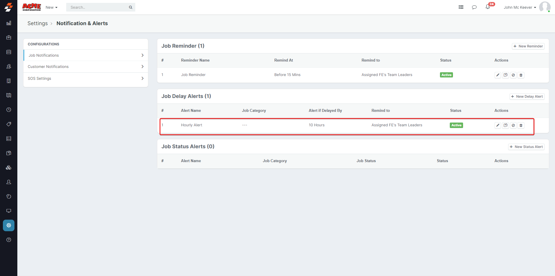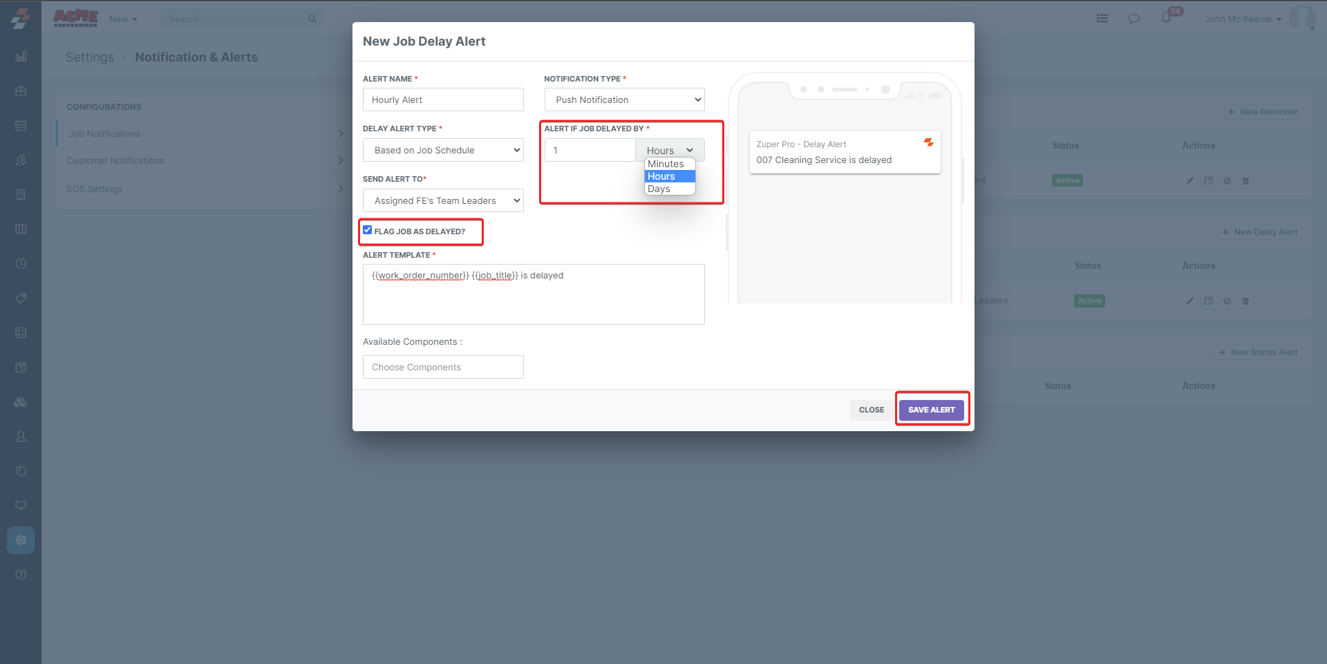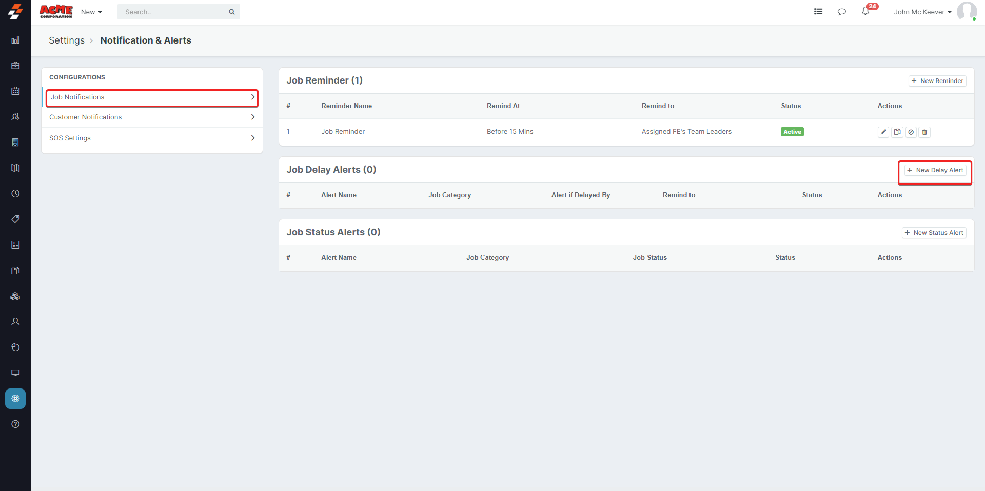 Navigation: Settings -> Configuration Settings -> Notification and Alerts -> Job Notifications ->Job Delay Alerts -> + New Job Delay AlertIt is easy to set new job delay alerts with delayed job flags, and job delay can be set for minutes, hours, and days.