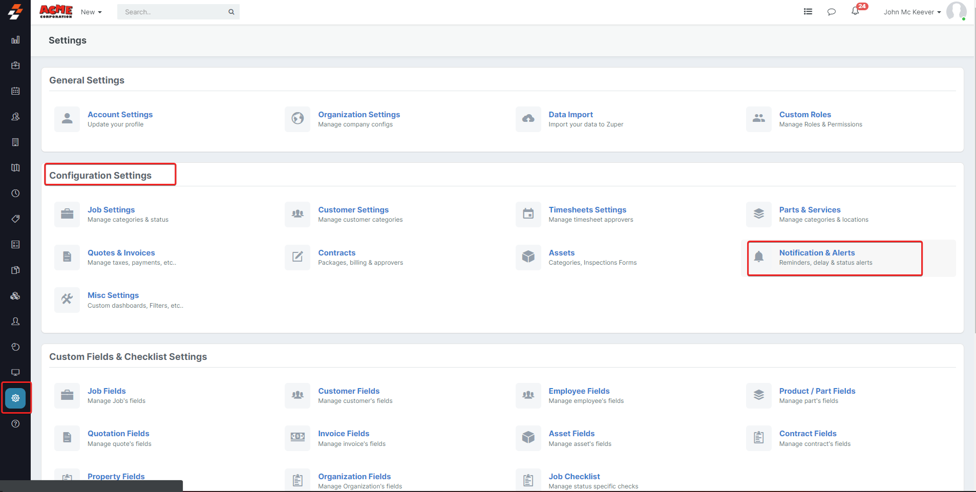 1. Select the “Settings” module from the left panel, and under “Configuration Settings,” select “Notification and Alerts.”Our new update is: