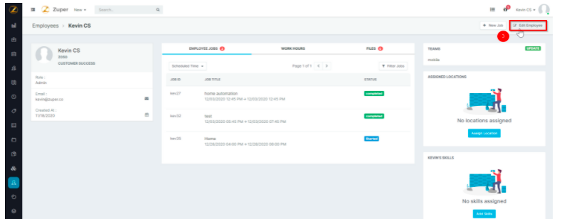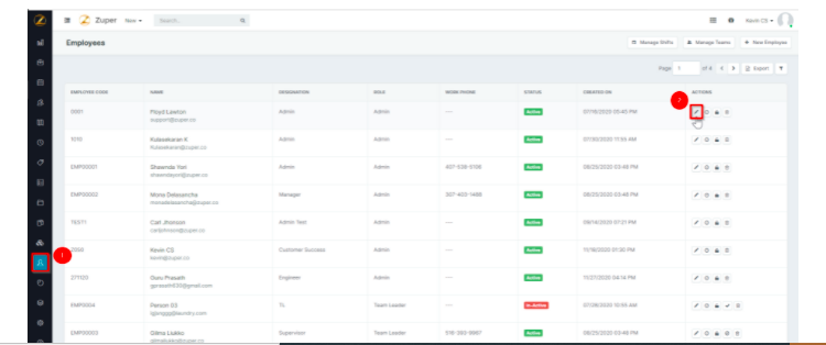 The details of an existing employee can be edited in Zuper in two ways. Directly from the Actions column in the Employee tab. From the employee's personal page. Steps to edit the employee details directly from the Actions column in the Employee tab ...