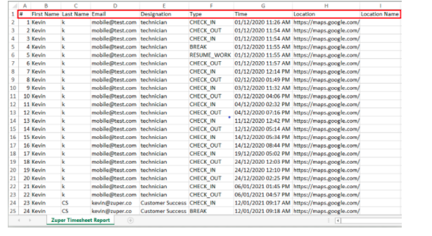 The timesheet Master Report provides the employees' time to time activity details from when they punch in, take a break, resume work, and punch out for any particular period. This includes Employee's First and Last Name, Email, Designation, Type of activity, Time of activity, and Location.