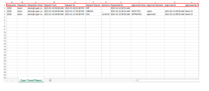 Time-Off Report shows the details of all the leave requests that the employees have placed with their approval statuses.
