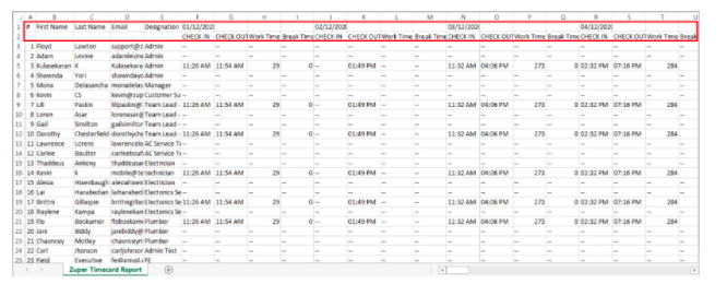 Employee Timecard Report details everyday work activities such as check-in, check out, work, and break time.