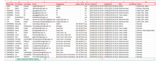 Employee Master Report provides details of the employees created in the Zuper App. The data includes personal information such as the Employee's First and Last Name, Email Address, Phone Number, and professional details such as the Employee Code, Active Status, Role, Team, and so on.