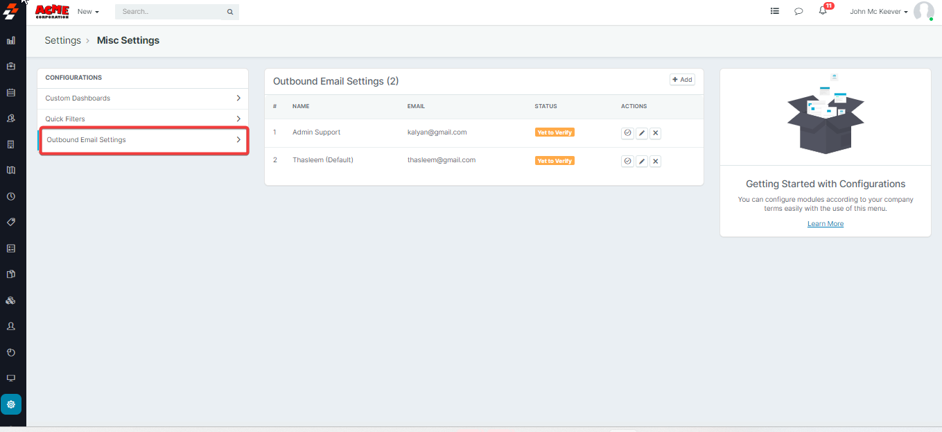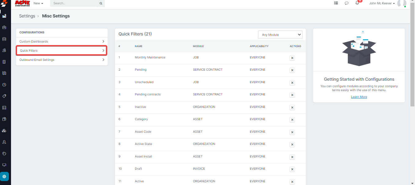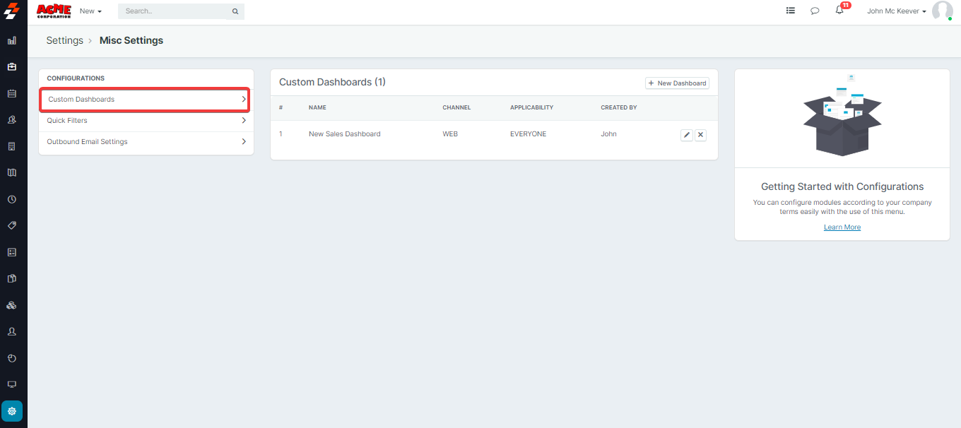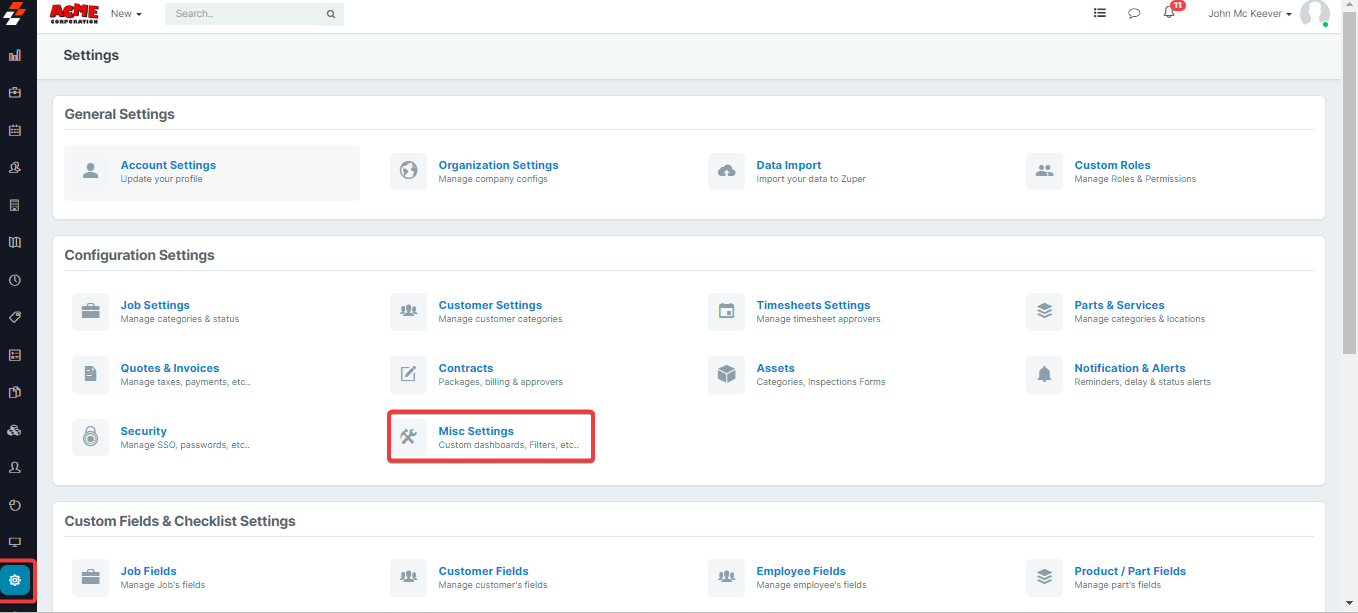 The Misc. settings of Zuper help you to manage the Custom Dashboards, Quick Filters, and Outbound Email Settings.