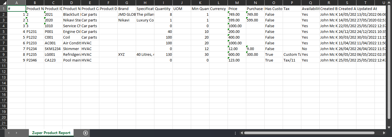 The Product Master Report is used to export all the information about the products created, including Product creation date, Product Name, Availability, Name, and more.