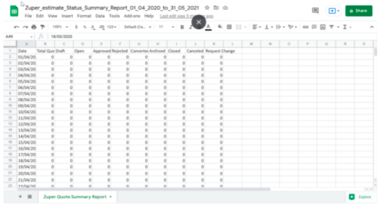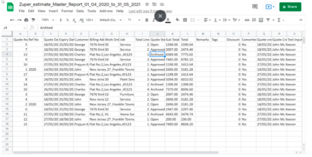 Note: If the report data is huge, it will not be downloaded as a file immediately. Instead, you will receive a notification email with a link to download the report. Reports generally include the quotation and invoice-related information such as the Quote Status, Invoice Status, Sub Total, Total, and also the Customer details such as Customer Name, Phone, Address, and so on.