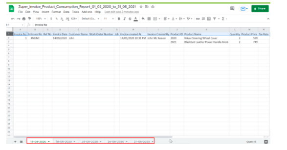 Invoice Product Consumption Report shows the products and parts consumption history with respect to each invoice.